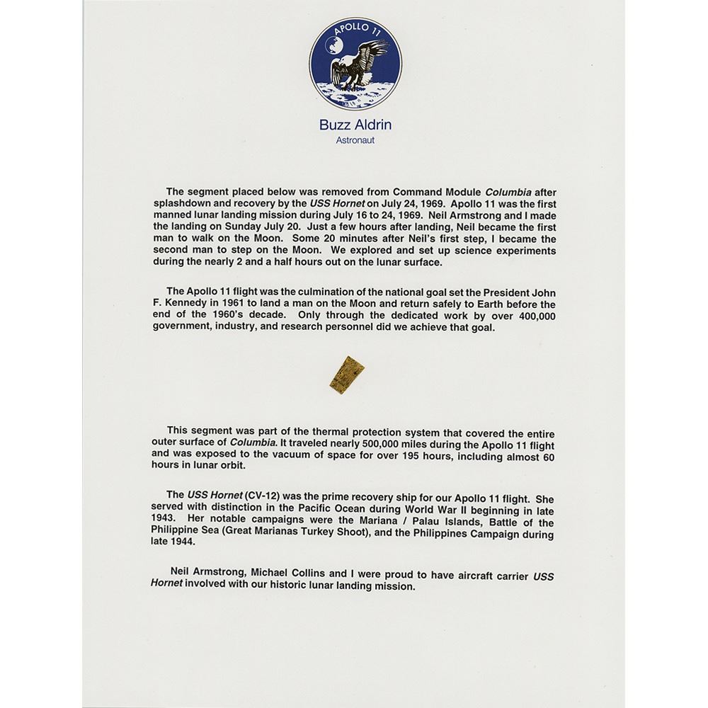 Desirable segment of Kapton foil from the collection of Apollo 11 LMP Buzz Aldrin, attested to as flown on the Command Module Columbia and removed following the mission. The small .5˝ x .25˝ segment is affixed to a descriptive sheet of Aldrin's personal letterhead, in part: "The segment placed below was removed from Command Module Columbia after splashdown and recovery by USS Hornet on July 24, 1969. Apollo 11 was the first manned lunar landing mission during July 16 to 24, 1969. Neil Armstrong and I made the landing on Sunday July 20. Just a few hours after landing, Neil became the first man to walk on the Moon. Some 20 minutes after Neil's first step, I became the second man to step on the Moon. We explored and set up science experiments during the nearly 2 and a half hours out on the lunar surface…This segment was part of the thermal protection system that covered the entire outer surface of Columbia. It traveled nearly 500,000 miles during the Apollo 11 flight and was exposed to the vacuum of space for over 195 hours, including almost 60 hours in lunar orbit." In fine condition.