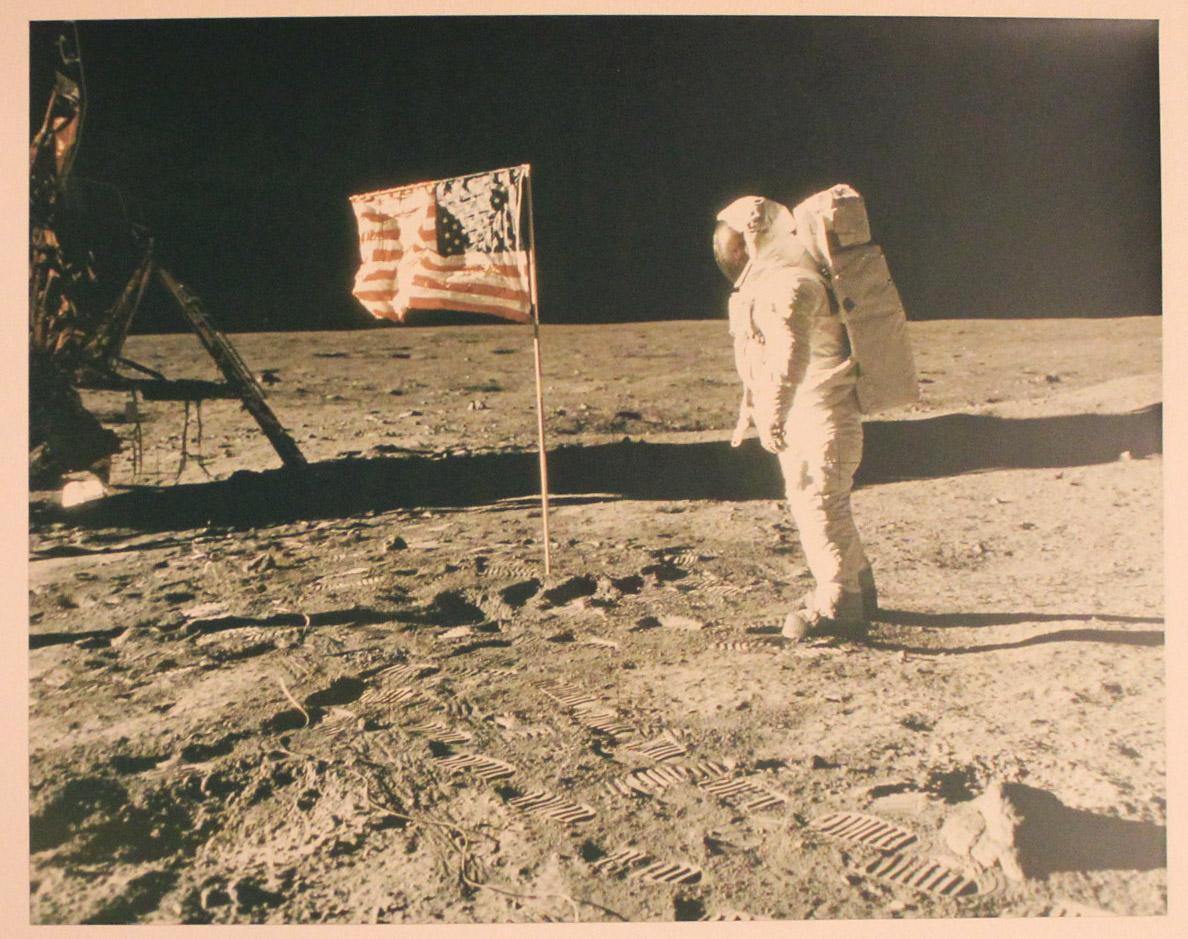 Exceptionally large 19.5'' x 15.5'' unsigned color matte photograph of Buzz Aldrin's famed Apollo 11 moonwalk. Fellow astronaut Neil Armstrong was tasked with documenting the momentous occasion. Photo is matted to an overall size of of 24'' x 20''. Near fine condition.