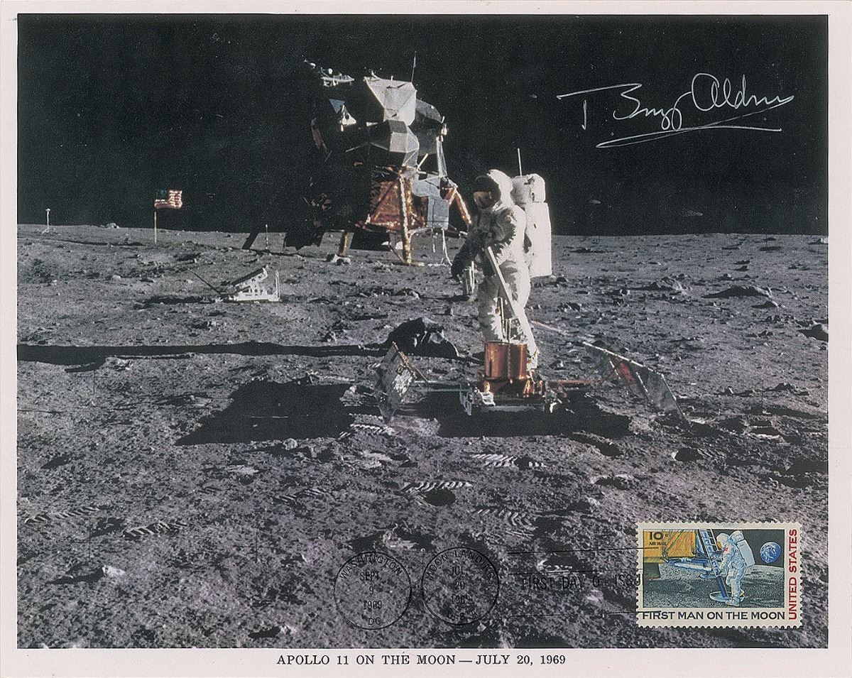 Two signed photos: an official color 10 x 8 NASA lithograph bearing an affixed postage stamp and first day cancelation, signed in silver ink by Aldrin; and a color glossy 4 x 6 postcard photo of Aldrin on the lunar surface, signed in blue felt tip by Aldrin. In overall fine condition, with scattered creasing to the litho. From the collection of aerospace memorabilia specialist Ken Havekotte. Pre-certified Zarelli Space Authentication.