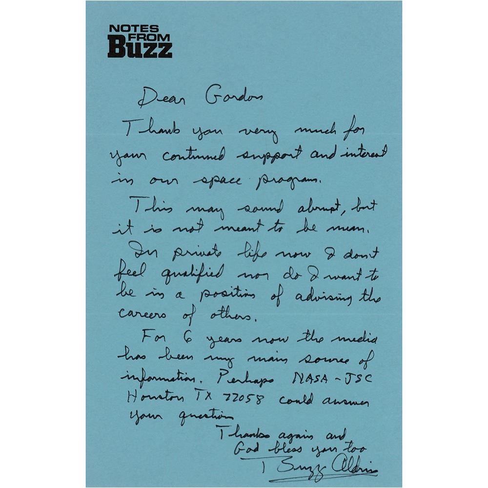 ALS, one page, 5.5 x 8.5, personal letterhead, no date. Handwritten letter to "Gordon," in part: "Thank you very much for your continued support and interest in our space program. This may sound abrupt, but it is not meant to be mean. In private life now I don't feel qualified nor do I want to be in a position of advising the careers of others. For 6 years now the media has been my main source of information. Perhaps NASA-JSC Houston TX 77058 could answer your question." In fine condition.