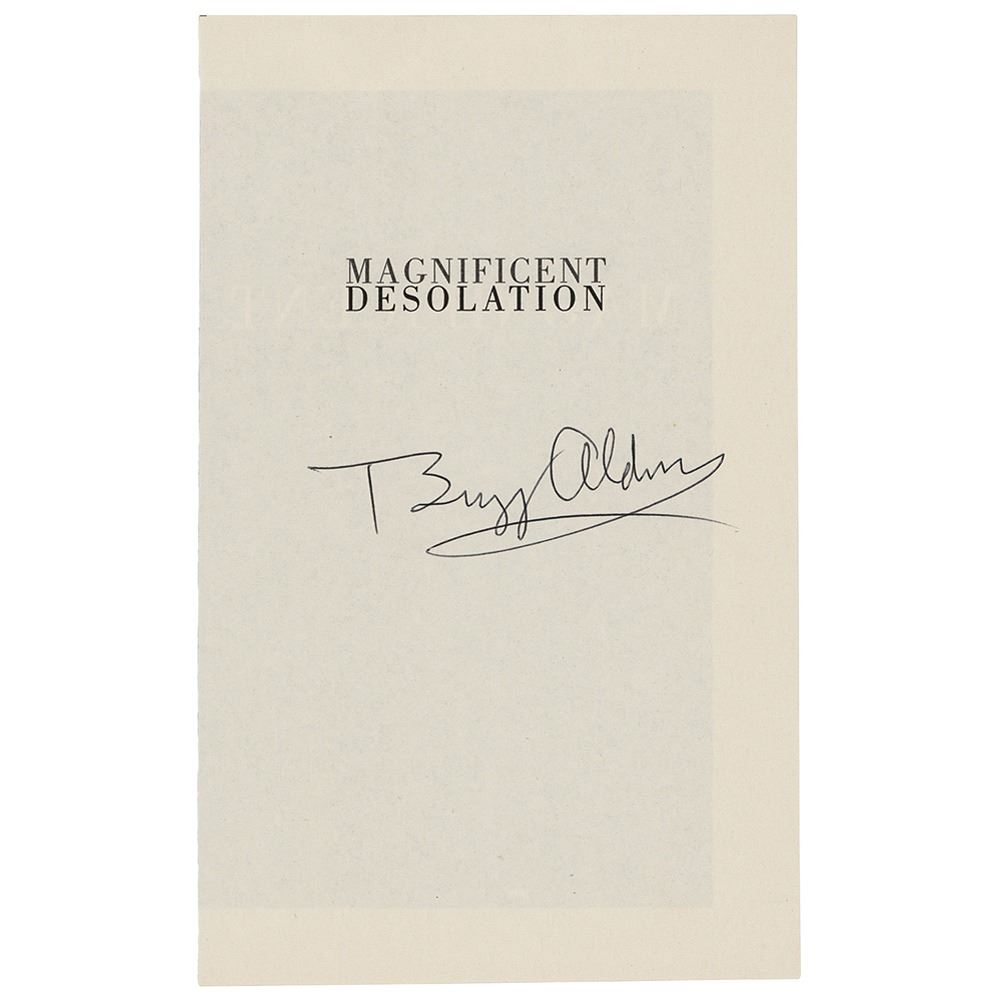 Ballpoint signature, "Buzz Aldrin,” on an off-white 5.75 x 9.25 page from his book Magnificent Desolation. In very fine condition.