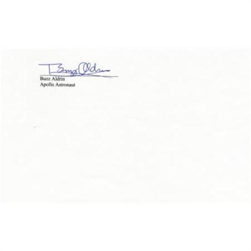 <B>Buzz Aldrin Signature</B></I> "<I>Buzz Aldrin</B></I>" in blue ink on a sheet, 8.5" x 5" on a printed line beneath which is typed his name and "Apollo Astronaut". Overall condition is fine, with an slightly uneven top margin.<BR><BR><b>Shipping:</b> Flat Material, Small (<a target="_blank" href="http://www.heritageauctions.com/common/shipping.php">view shipping information</a>)
