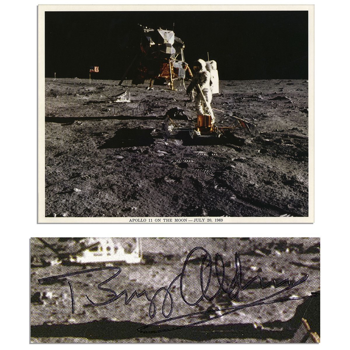 Moonwalk photo signed ''Buzz Aldrin'' in black ink. NASA publicity shot of Aldrin walking on the moon features a small summary of the mission printed to verso. Semi-matte photo measures 10'' x 8''. Some tape to verso, else near fine.