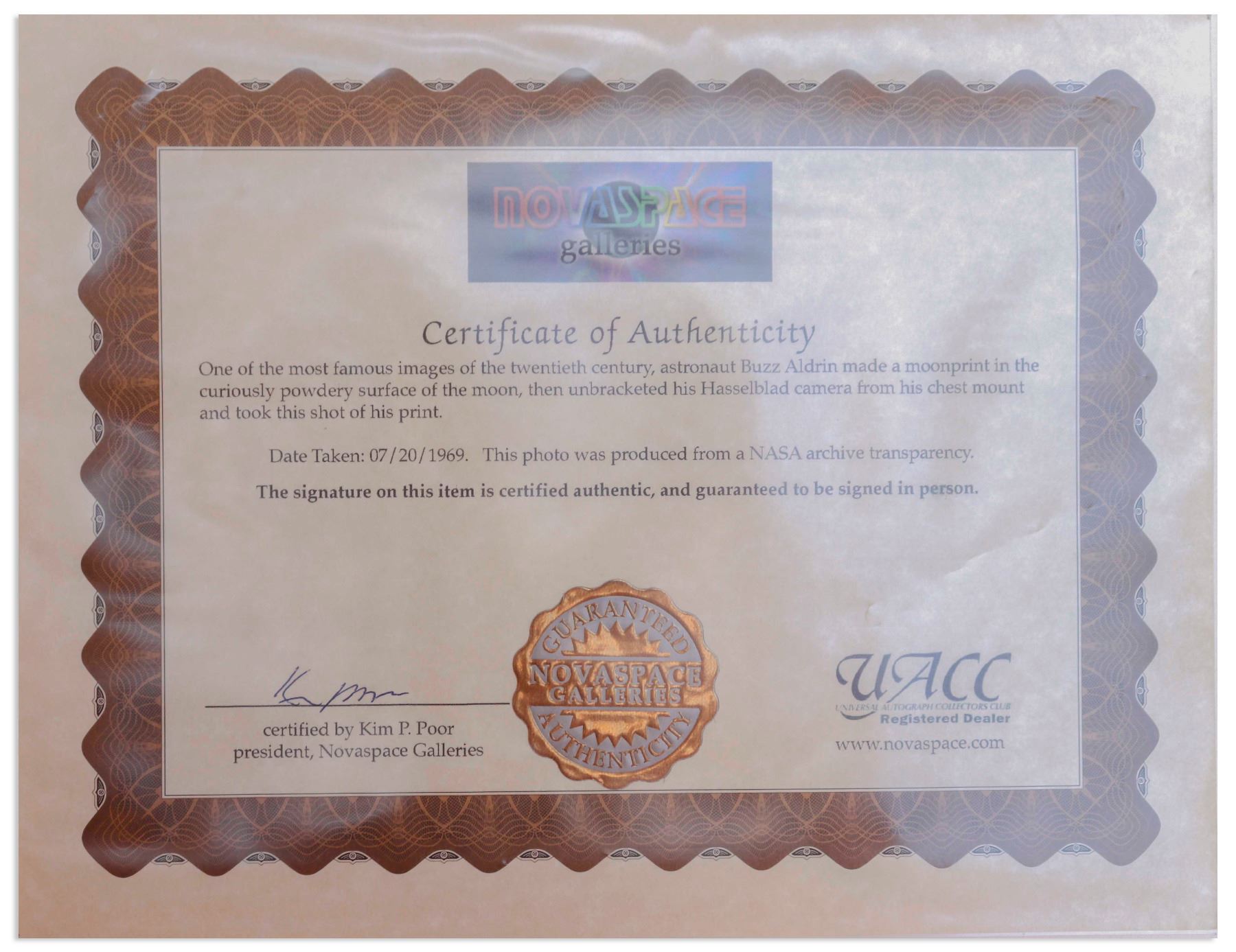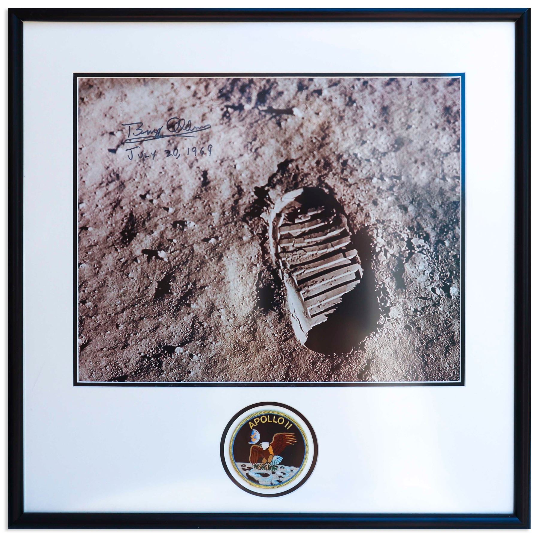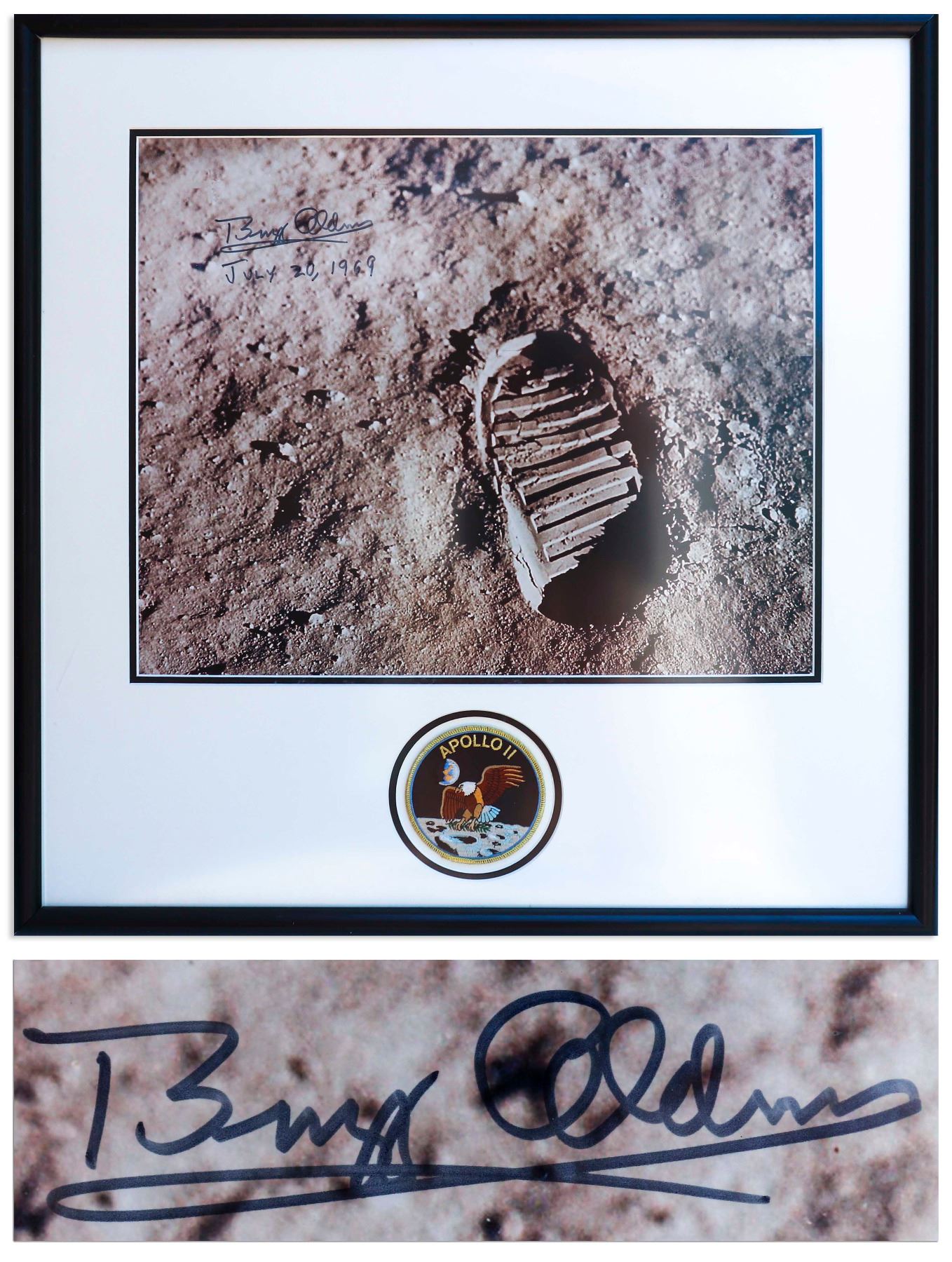 Buzz Aldrin signed 20'' x 16'' photo showing his footprint upon the moon, an impression showing the powdery lunar surface. Aldrin signs in blue felt-tip, adding the date of the historic moon landing: ''Buzz Aldrin / July 20, 1969''. Not examined out of frame, photo appears near fine, framed with an Apollo 11 patch to a size of 26.75'' x 27''. Plexiglass of frame has scratch to left margin. With Novaspace COA.