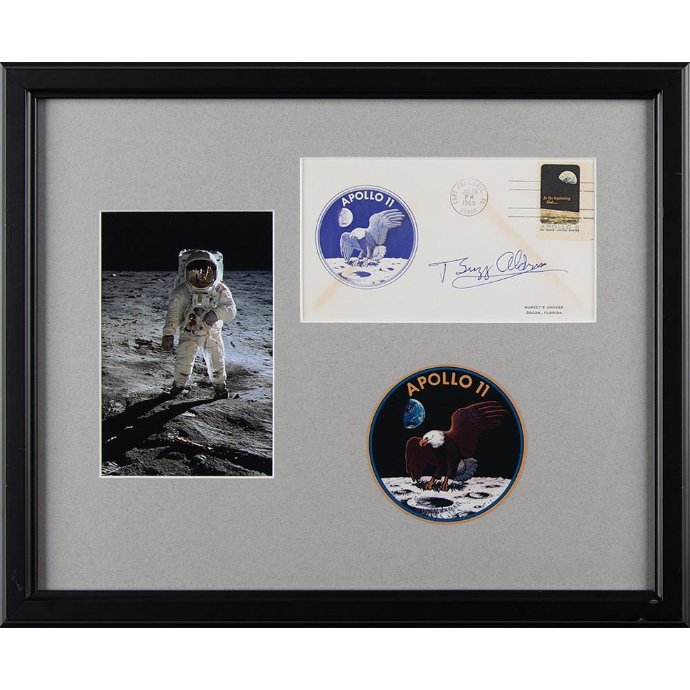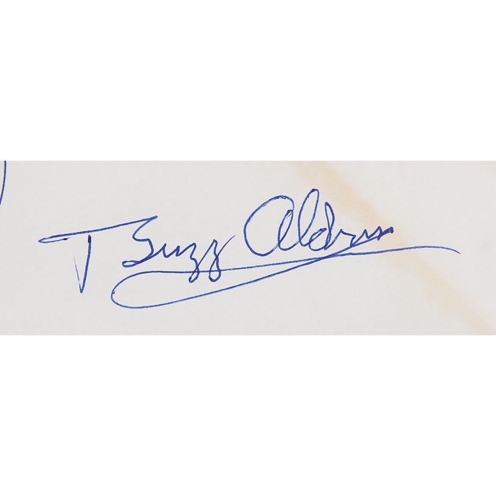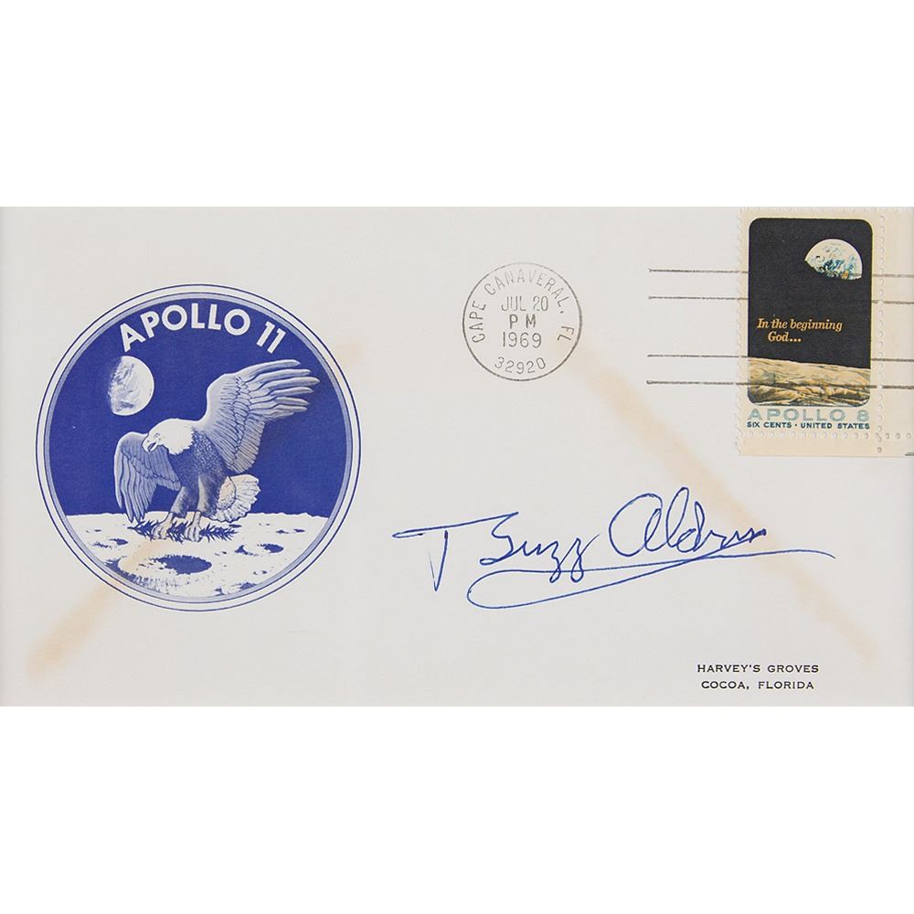 Commemorative cover with a cachet of the Apollo 11 mission insignia, postmarked at Cape Canaveral on the moon-landing date of July 20, 1969, signed in blue ballpoint by Buzz Aldrin. Matted and framed with an Apollo 11 decal and photo of Aldrin on the moon to an overall size of 15 x 12.25. In very good to fine condition, with two light envelope-related stains.