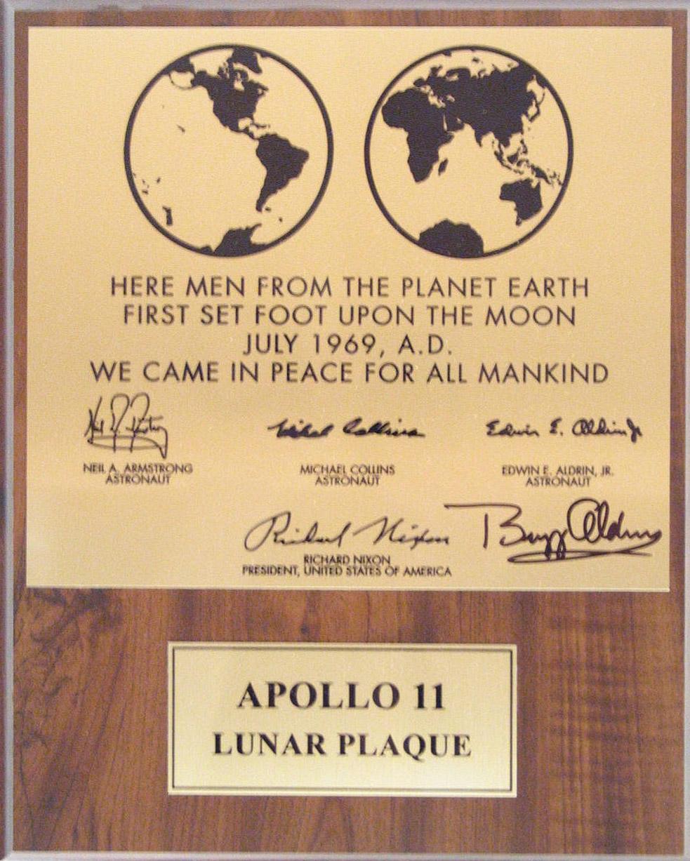 Excellent Apollo 11 lunar plaque signed by astronaut Buzz Aldrin. Plaque is a reproduction of the actual plaque left on the Moon by the Apollo 11 astronauts in 1969 and reads in part: ''Here Men From the Planet Earth First Set Foot Upon the Moon…We Came in Peace For All Mankind…'' With facsimile signatures of Neil Armstrong, Michael Collins, Edwin ''Buzz'' Aldrin and Richard Nixon. Aldrin signs ''Buzz Aldrin'' next to his facsimile signature. Wood and gold metal plaque measures 10.5'' x 13''. Fine.