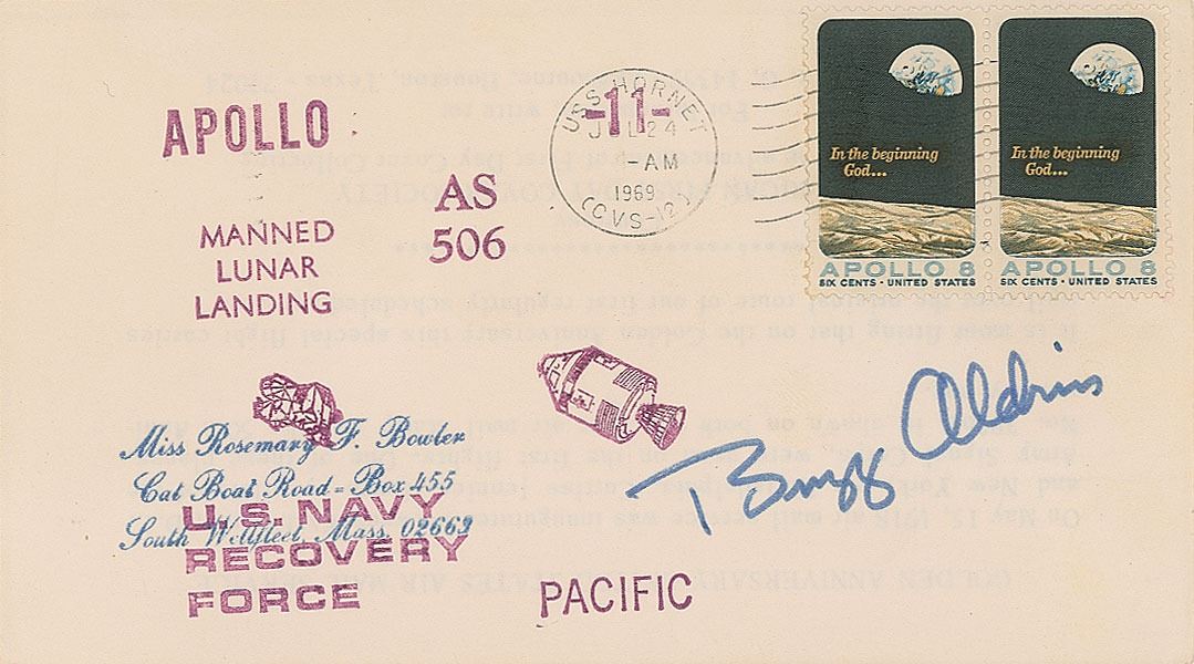 Apollo 11 recovery cover with a stamped cachet honoring the U.S. Navy Recovery Force in the Pacific, postmarked on the USS Hornet on the return date of July 24, 1969, signed in blue felt tip, "Buzz Aldrin." In fine condition. The Apollo 11 crew was recovered by the USS Hornet upon splashdown in the North Pacific Ocean following their successful moon landing mission.