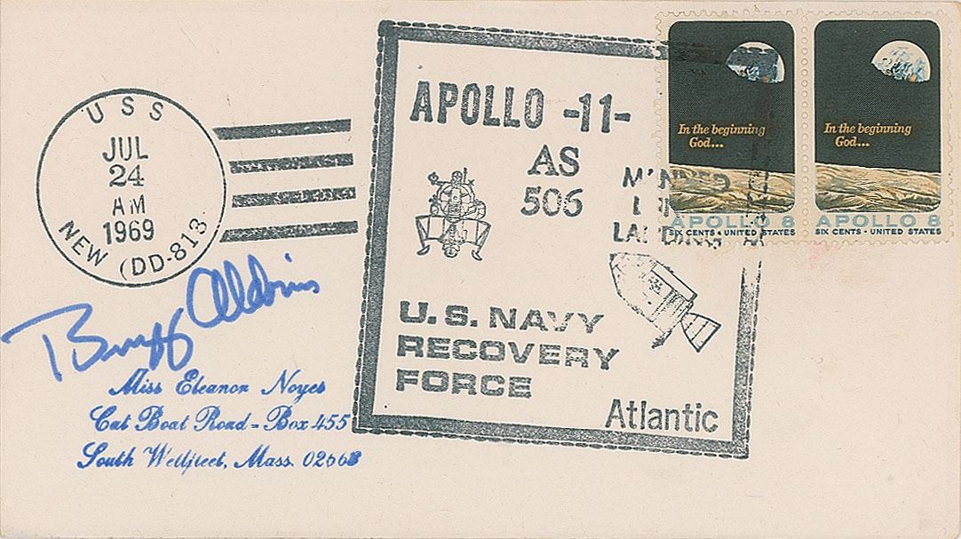 Apollo 11 recovery cover with a stamped cachet honoring the U.S. Navy Recovery Force in the Atlantic, postmarked on the USS New on the return date of July 24, 1969, signed in blue felt tip, "Buzz Aldrin." In fine condition. The USS New was part of the support fleet for the Apollo 11 moon landing, stationed in the launch abort area in the Atlantic Ocean; the crew was ultimately recovered by the USS Hornet upon splashdown in the North Pacific Ocean following their successful moon landing mission.