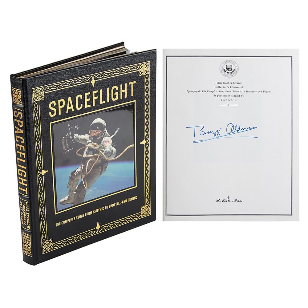 Signed book: Spaceflight: The Complete Story From Sputnik to Shuttle"”And Beyond. Collector's edition. Norwalk, CT: Easton Press, 2007. Leatherbound hardcover, 10 x 12.25, 320 pages. Prominently signed on the colophon in blue felt tip by Buzz Aldrin. In very fine condition. Accompanied by the publisher's certificate of authenticity.