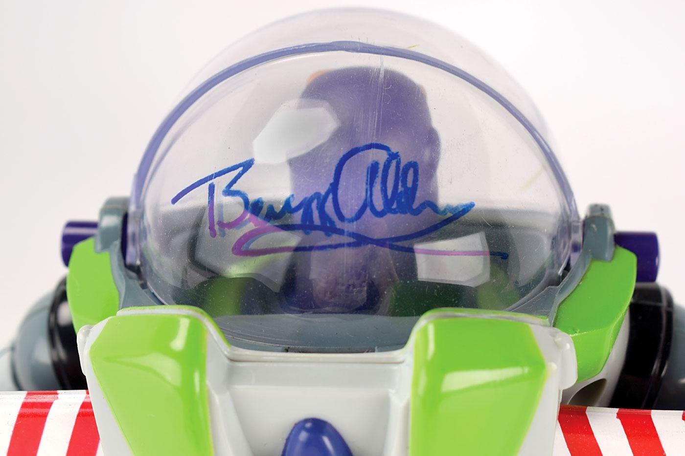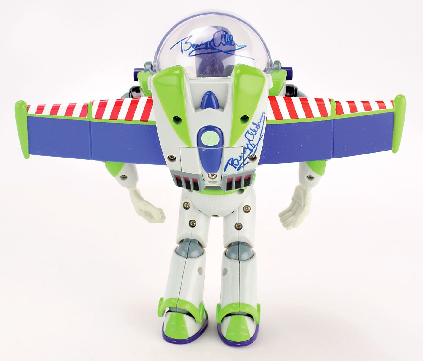 Fantastic Buzz Lightyear action figure, standing 8? tall with wings extended 9? in length, signed on the back of the retractable helmet in blue felt tip by Buzz Aldrin, who signs a second time on the suit's flight system. In fine condition, with right and left arms inexplicably attached to opposite sides. In the Toy Story movie Buzz Lightyear was named after Buzz Aldrin. After initially denying that was the case, Disney admitted the similarities. Buzz Aldrin doesn’t often sign Buzz Lightyear toys.