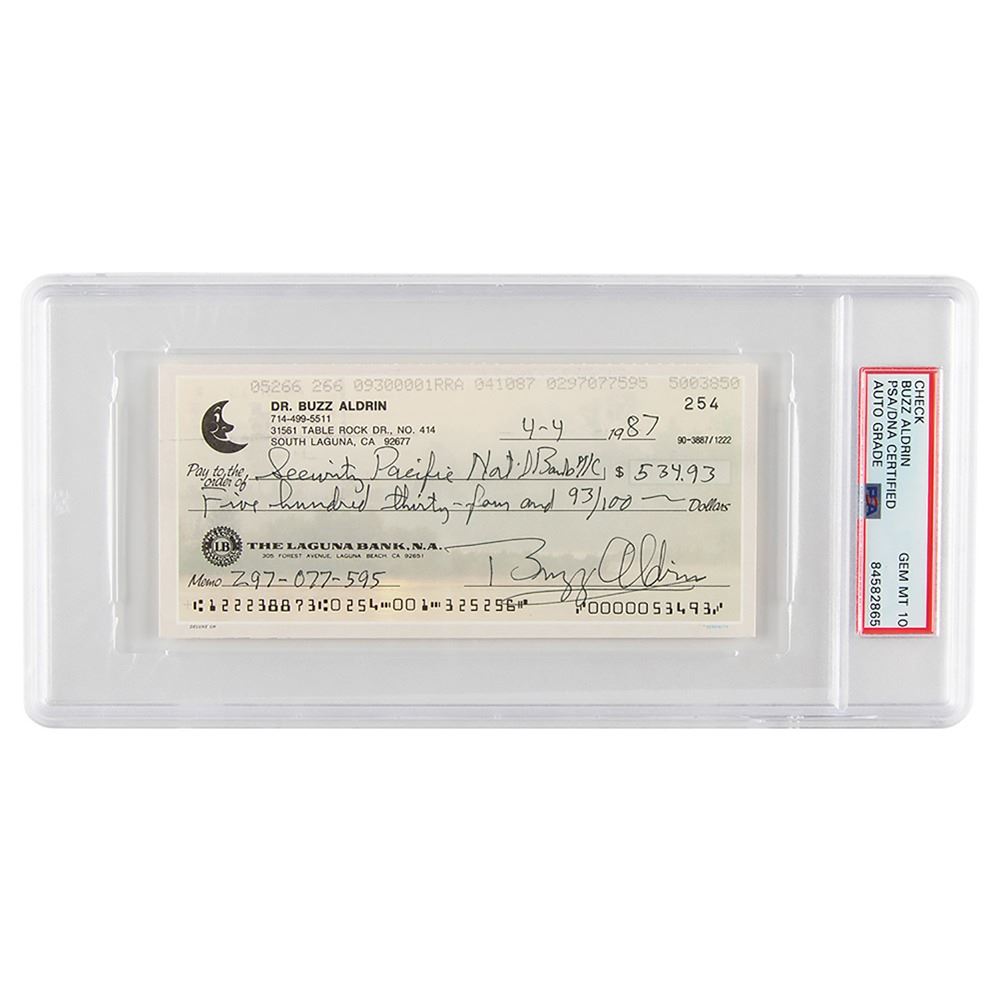 Personal check, 6 x 2.75, filled out and signed by Buzz Aldrin, payable to Security Pacific National Bank for $534.93, April 4, 1987. In fine condition. Encapsulated and graded by PSA/DNA as "GEM MT 10." Accompanied by a full letter of authenticity from JSA.