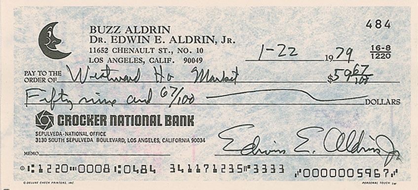 Uncommon personal check, 6 x 2.75, filled out and signed by Aldrin, "Edwin E. Aldrin, Jr.," payable to Westward Ho Market for $59.67, January 22, 1979. In fine condition.