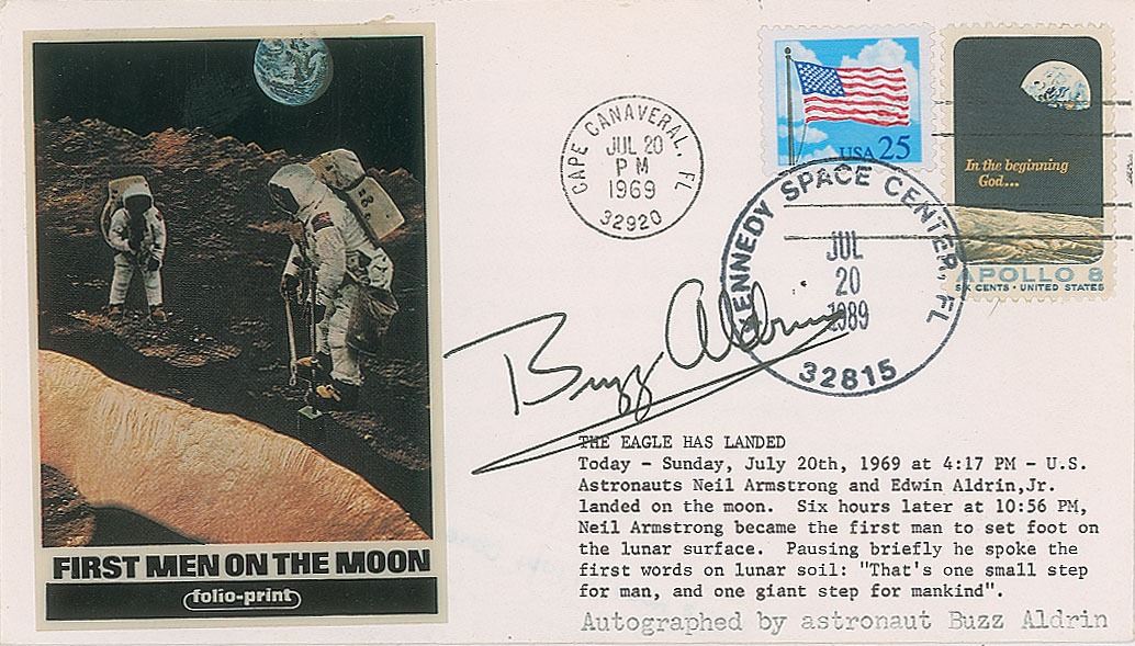 Commemorative cover with a "First Men on the Moon" folio print cachet, postmarked at the Kennedy Space Center on July 20, 1989, the 20th anniversary of the Apollo 11 moon-landing, signed in black ink by Buzz Aldrin. In fine condition.