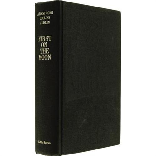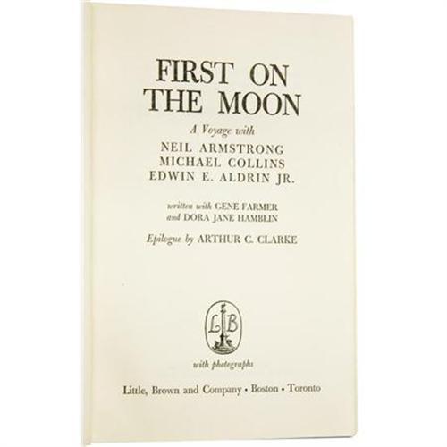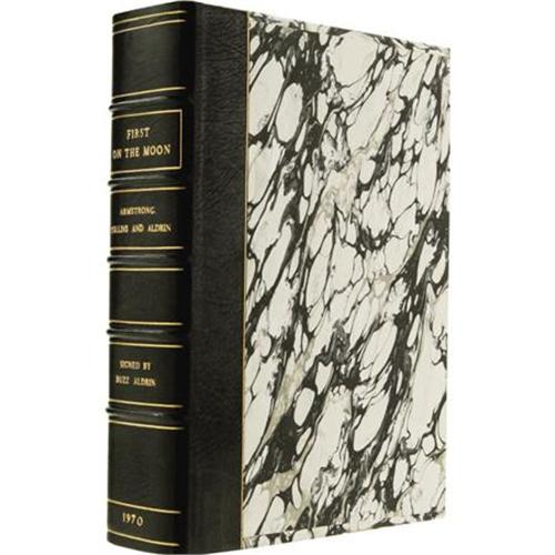 <B>Neil Armstrong, Michael Collins, and Edwin E. Aldrin, Jr.: <I>First on the Moon</B></I></B></I> <B>Signed by Buzz Aldrin.</B></I> Written with Gene Farmer and Dora Jane Hamblin. Epilogue by Arthur C. Clarke. (Boston and Toronto: Little, Brown and Company, 1970), 511 pages, black cloth with gilt lettering on the spine, 8vo (5.5" x 8.5"), no dust jacket, clear plastic protective sleeve on boards, housed in a black quarter leather slipcase with marbled boards and gilt titles & five raised bands on the spine. Signed "<I>Buzz Aldrin</B></I>" on the half-title page. Very good condition.<BR><BR><b>Shipping:</b> Books & Catalogs (<a target="_blank" href="http://www.heritageauctions.com/common/shipping.php">view shipping information</a>)