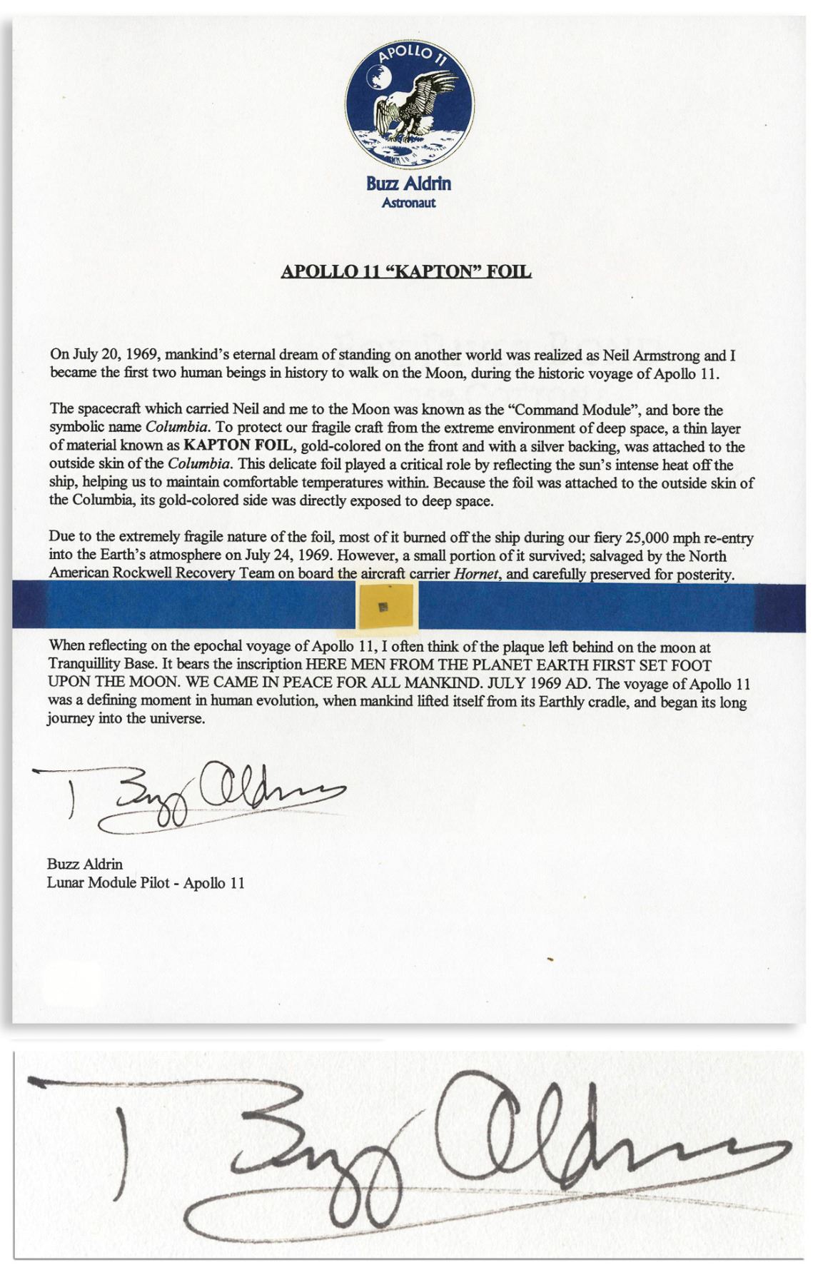 Piece of Kapton foil from Columbia, the Apollo 11 command module. Foil is accompanied by a signed letter of authenticity from Buzz Aldrin, who writes in part, ''The spacecraft which carried Neil and me to the Moon was known as the 'Command Module', and bore the symbolic name Columbia. To protect our fragile craft from the extreme environment of deep space, a thin layer of material known as KAPTON FOIL...was attached to the outside skin of the Columbia...most of it burned off the ship during our fiery 25,000 mph re-entry into the Earth's atmosphere on July 24, 1969. However, a small portion of it survived...carefully preserved for posterity.'' Signed ''Buzz Aldrin'' in black felt-tip. Foil measures approximately .125'' square, encapsulated in a plastic casing for display with the letter. Casing measures approximately .75'' square and letter measures 8.5'' x 11''. Near fine condition.