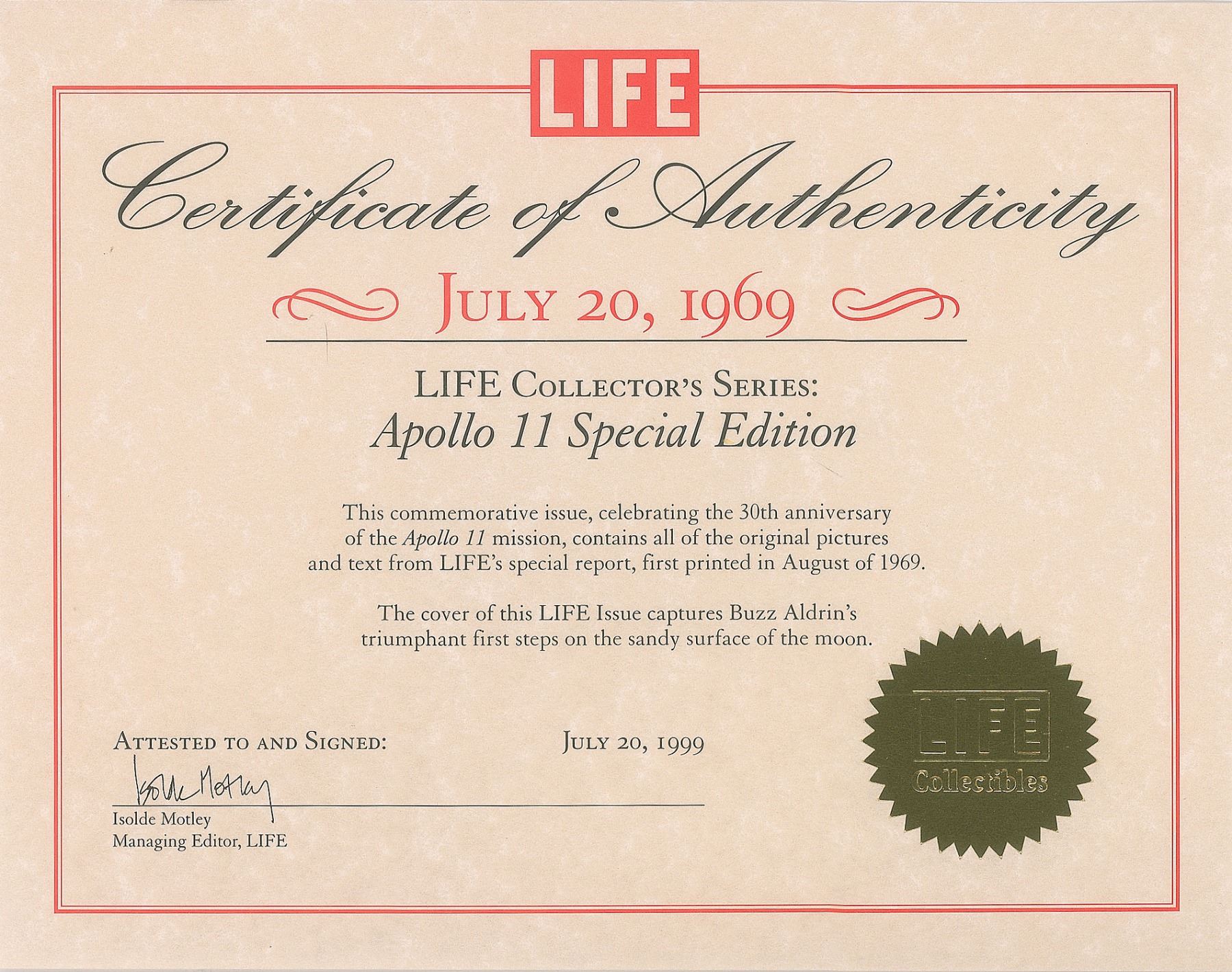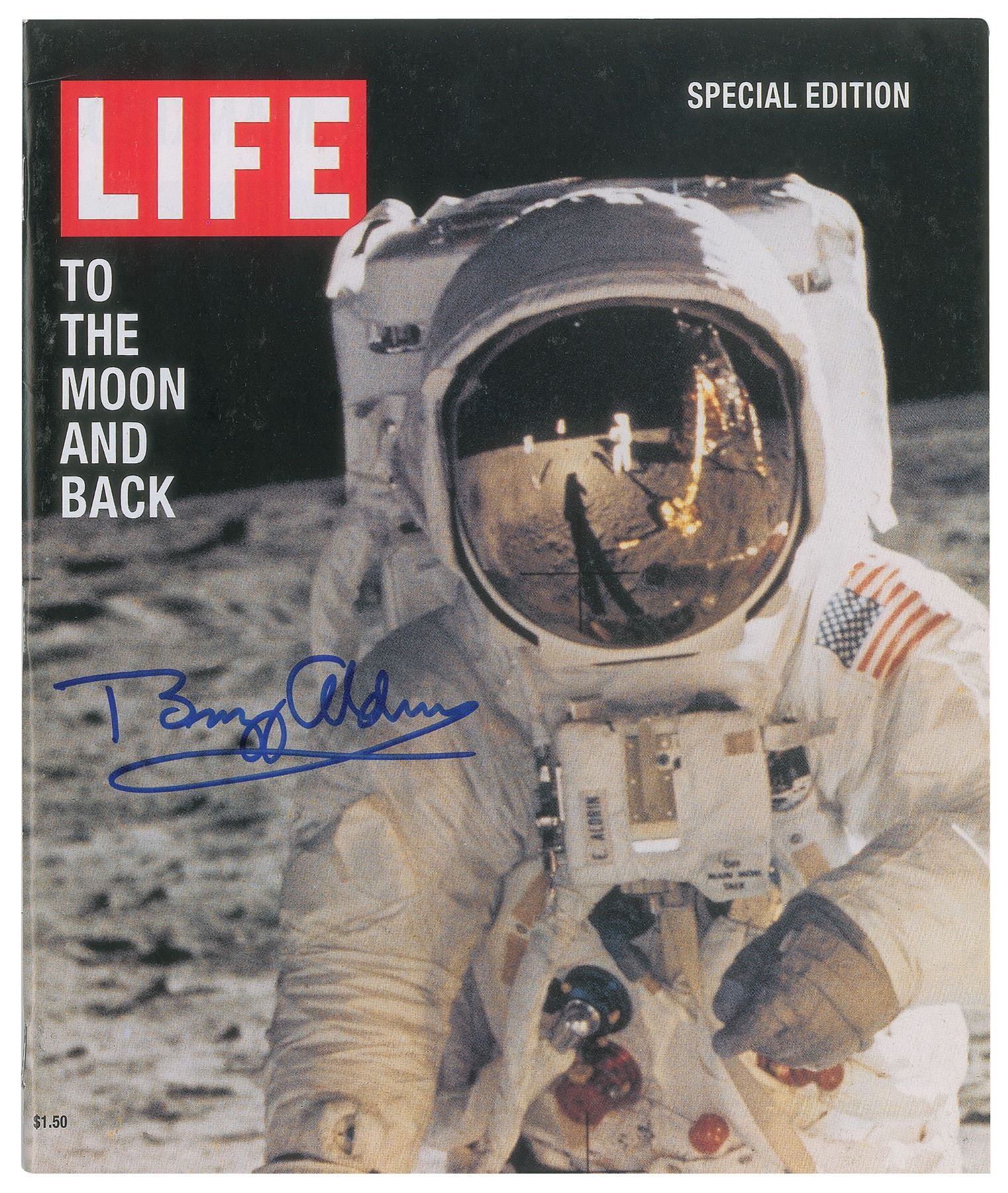 Special edition 30th anniversary commemorative issue of Life magazine from August 11, 1969, 9 x 11, signed on the front cover in blue felt tip by Buzz Aldrin. Housed in its original Life Collector's Series presentation folder with accompanying certificate of authenticity. In fine condition.