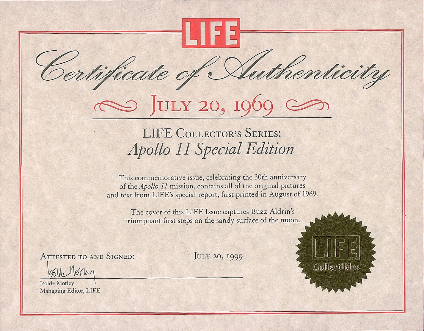 Special edition 30th anniversary commemorative issue of Life magazine from August 11, 1969, 9 x 11, signed on the front cover in blue felt tip by Buzz Aldrin. Housed in its original Life Collector's Series presentation folder with accompanying certificate of authenticity. In fine condition.