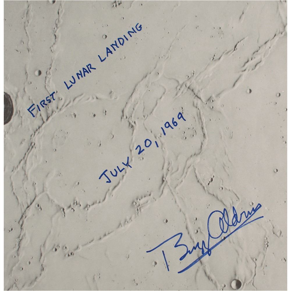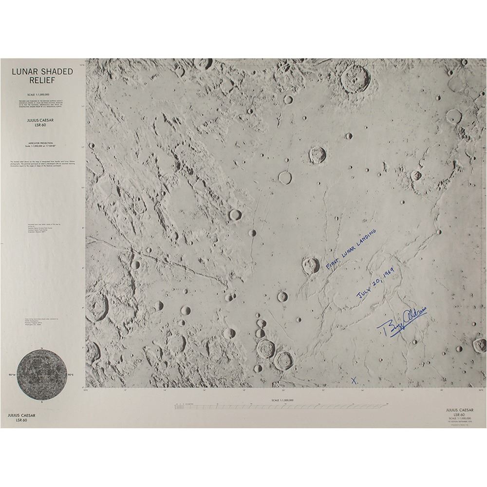 First edition Lunar Shaded Relief map entitled "Julius Caesar, LSR 60," prepared by the Defense Mapping Agency for NASA in September 1978, scale 1:1,000,000, 29 x 22, boldly and cleanly signed in blue felt tip, "First Lunar Landing, July 20, 1969, Buzz Aldrin," who also marks the Apollo 11 landing site with an "X." Rolled and in fine condition. Julius Caesar is a lava-flooded lunar impact crater with a low, irregular, and heavily worn wall with a diameter of 85 km. Named after Roman statesman Julius Caesar, it is located to the west of Mare Tranquillitatis, and directly southeast of the crater Manilius on the Mare Vaporum.
