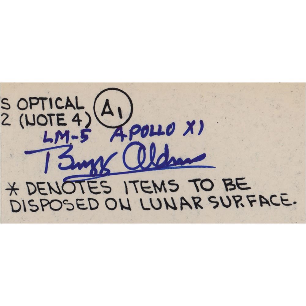 Highly desirable original blueprint by Grumman Aircraft Engineering Corp. for the ascent stage of the Apollo Lunar Module, 16 x 10.5, signed in the upper right corner in blue felt tip, "LM-5, Apollo XI, Buzz Aldrin." Identified in the lower right corner with part number "LDW340-55002 C," the diagram portrays the internal locations of several of the spacecraft's essential elements: "Food," "Pilots Preference Kit," "Crewman's Optical Alignment Sight," "Lunar Overshoes & PGA Gas Connector Covers," "PLSS Condensate Container," "Sample Return Containers," and more. Several items‰ÛÓlike "Urine Collection Assy," "Food Waste," and "Defecation Collection Devices"‰ÛÓare marked with asterisks to denote "items to be disposed on lunar surface." In fine condition.