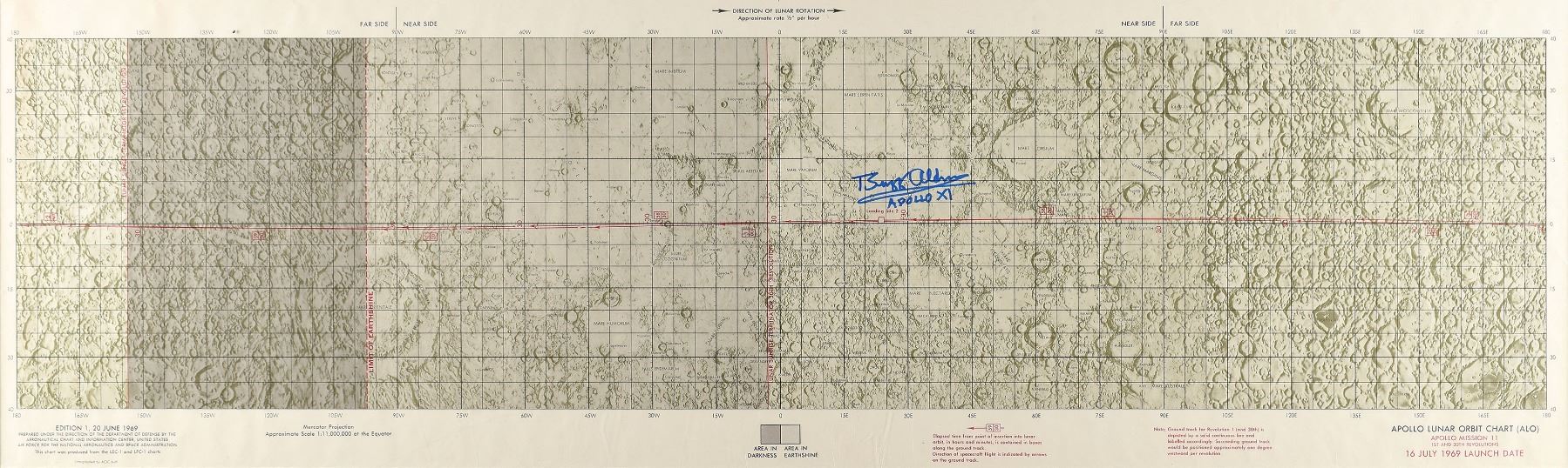 Appealing color first edition Apollo 11 Lunar Orbit Chart for the mission's 1st and 30th revolutions, 41 x 12, dated June 20, 1969, displaying a Mercator projection with areas in darkness and sunlight as on the planned landing day, signed in blue felt tip, "Buzz Aldrin, Apollo XI." Lithographed by ACIC 6-69, and prepared under the direction of the Department of Defense by the Aeronautical Chart and Information Center. Rolled and in fine condition.