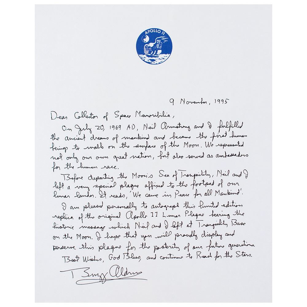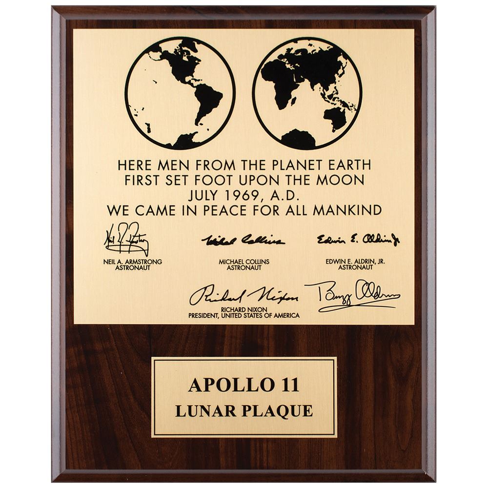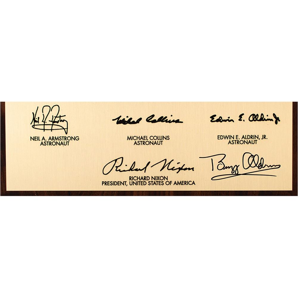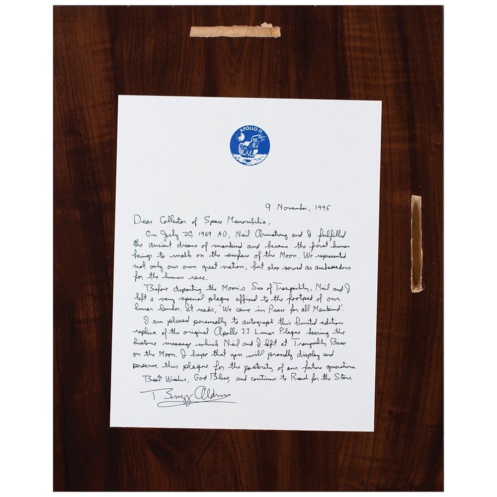 Highly desirable replica 9.25 x 8 metal lunar plaque similar to the one left on the moon's surface by the Apollo 11 crew, affixed to a wooden 10.5 x 13 mount, signed below his facsimile signature in black felt tip by Buzz Aldrin. The iconic plaque reads: "Here men from the planet Earth first set foot upon the moon, July 1969, A.D. We came in peace for all mankind." Reverse of plaque bears a preprinted handwritten letter from Aldrin, who notes: "I am pleased personally to autograph this limited edition replica of the original Apollo 11 Lunar Plaque." In fine condition. Accompanied by the original box.