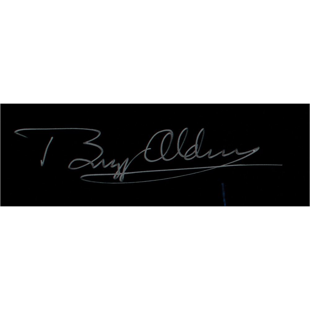 Color satin-finish 20 x 16 photo of Buzz Aldrin saluting the American flag on the lunar surface during his Apollo 11 EVA, signed in silver ink, "Buzz Aldrin." In fine condition.
