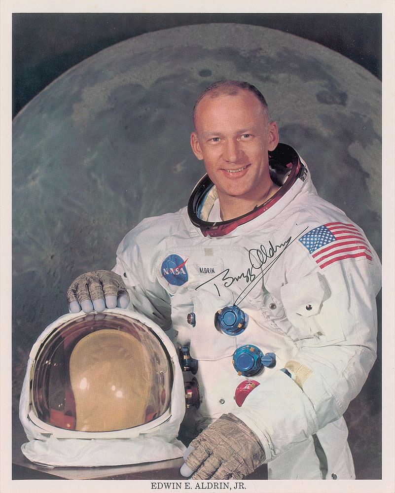 Official color 8 x 10 NASA lithograph of Buzz Aldrin posing in his white space suit against a lunar background, signed in thin black felt tip. In fine condition. An ideal, uninscribed image of history's second moonwalker.