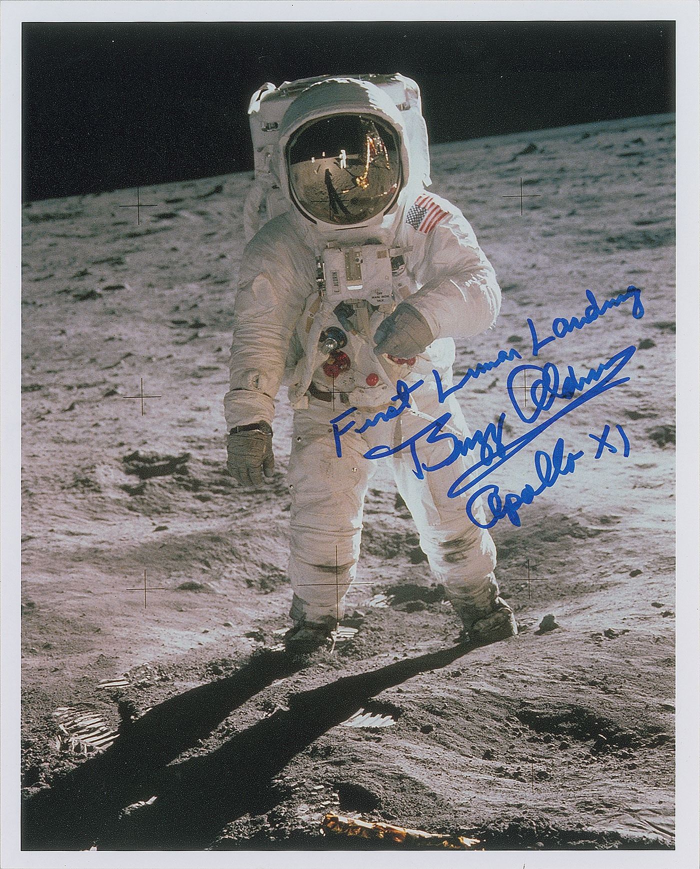 Color satin-finish 8 x 10 full-length photo of Aldrin standing on the lunar surface, his visor showing a small reflection of the photographer, Neil Armstrong, signed in blue felt tip, "First Lunar Landing, Buzz Aldrin, Apollo XI." In very fine condition.