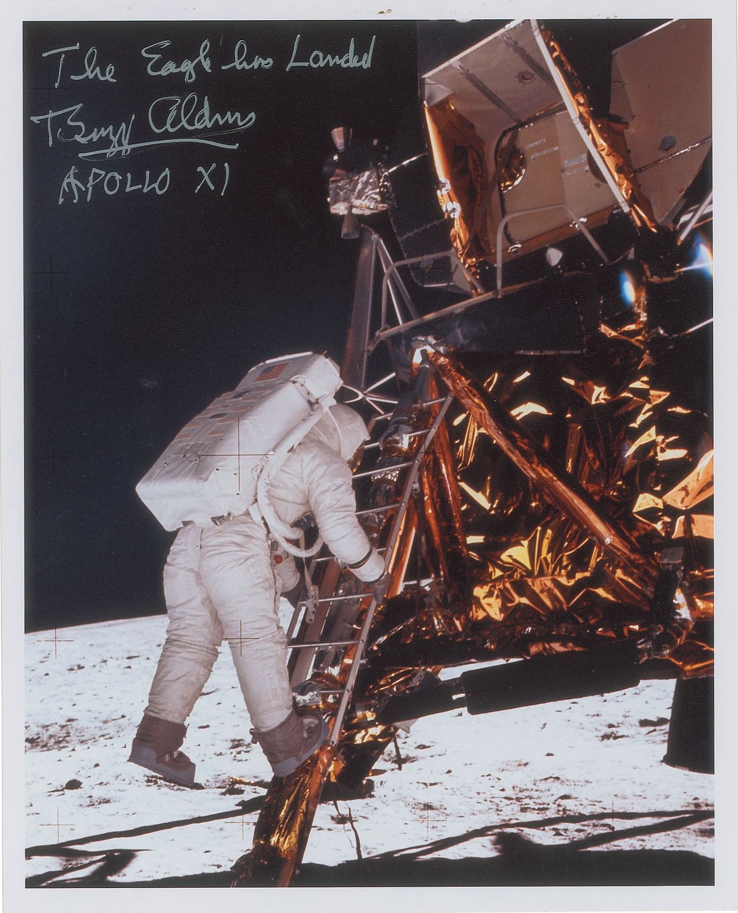 Fantastic color satin-finish 8 x 10 photo of Aldrin on the ladder of the Lunar Module 'Eagle,' signed in silver ink, "The Eagle has Landed, Buzz Aldrin, Apollo XI." In very fine condition.