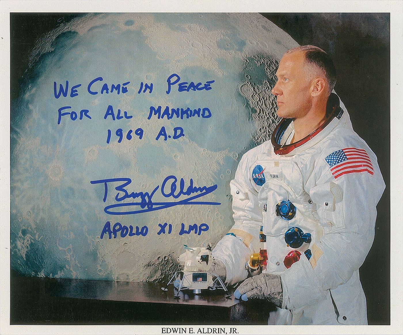 Fantastic color 10 x 8 lithograph of Aldrin in near-profile against a large lunar background, prominently signed in blue felt tip, "We Came In Peace For All Mankind, 1969 A.D., Buzz Aldrin, Apollo XI LMP." In very fine condition.