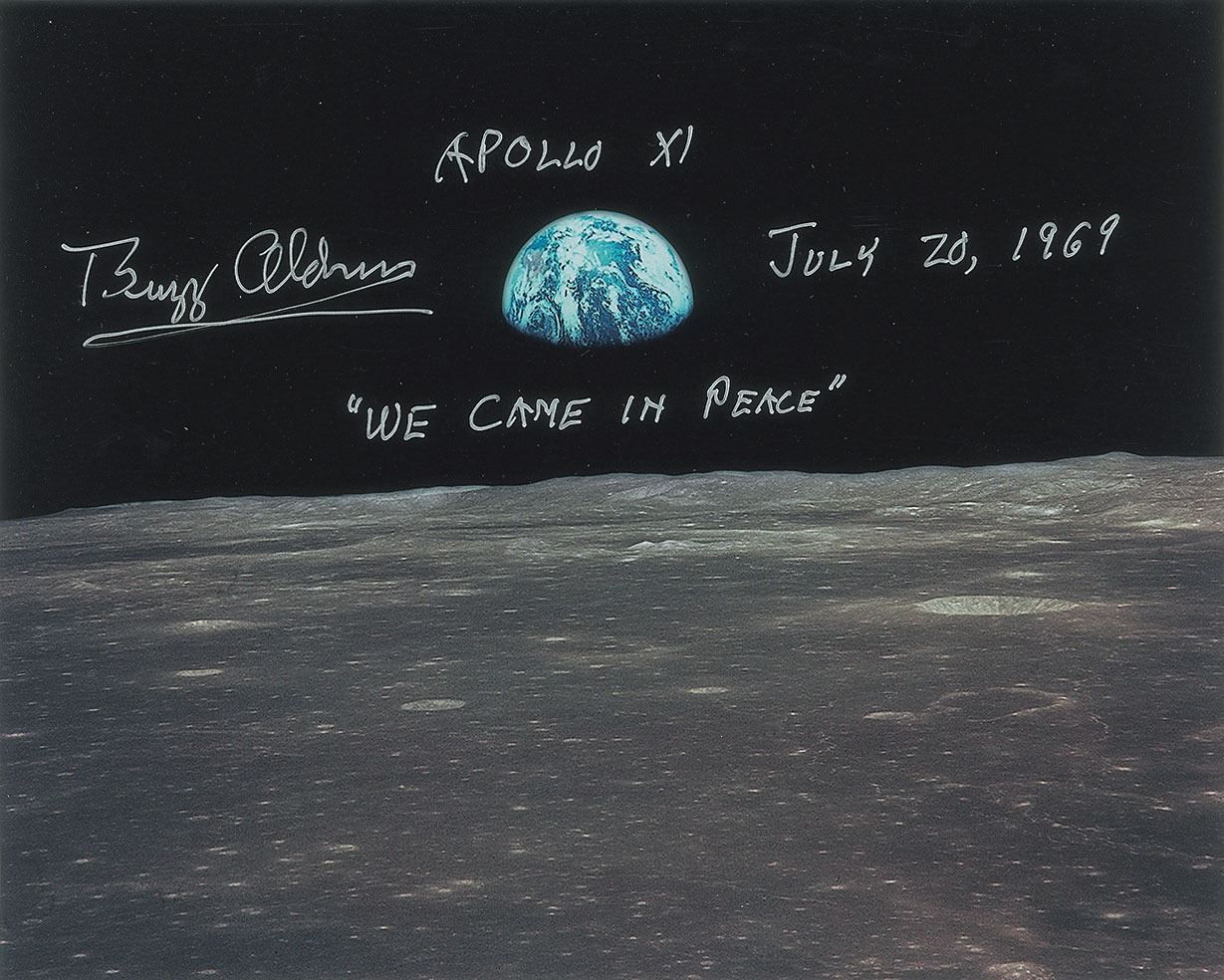 Ideal color semi-glossy 10 x 8 photo of the Earth hovering beautifully over the moon's desolate, alien terrain, signed in silver ink, "Buzz Aldrin, Apollo XI, July 20, 1969, 'We came in peace.'" In very fine condition.