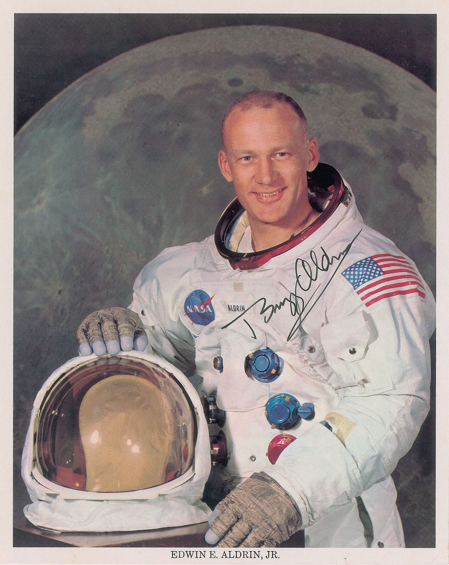 Iconic official color 8 x 10 NASA lithograph of Buzz Aldrin posing in his white space suit against a lunar backdrop, boldly signed in black felt tip. In fine condition.