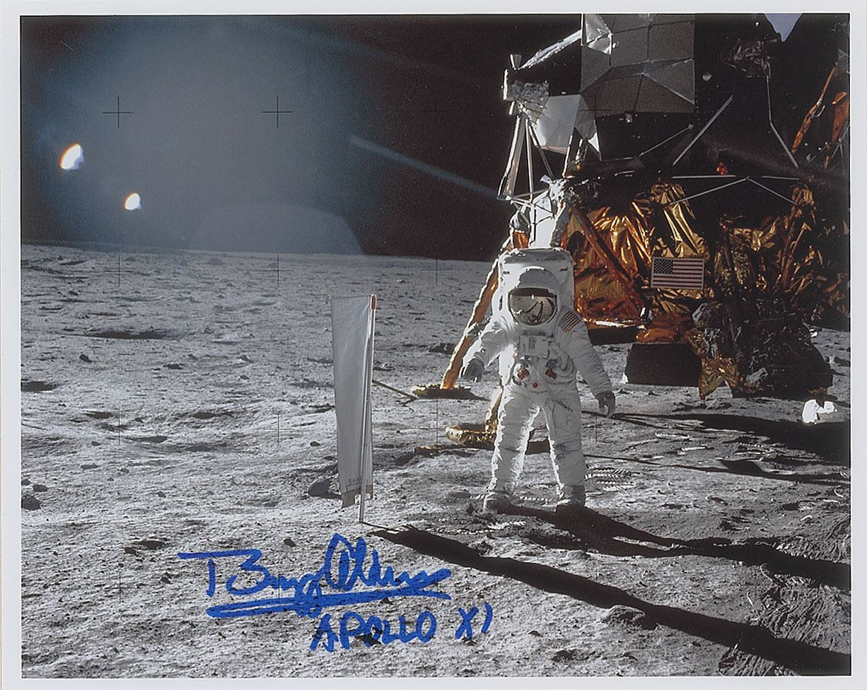 Color satin-finish 10 x 8 full-length photo of LMP Aldrin attending to the Solar Wind Composition Experiment during the Apollo 11 mission, signed in blue felt tip, "Buzz Aldrin, Apollo XI." In very fine condition.