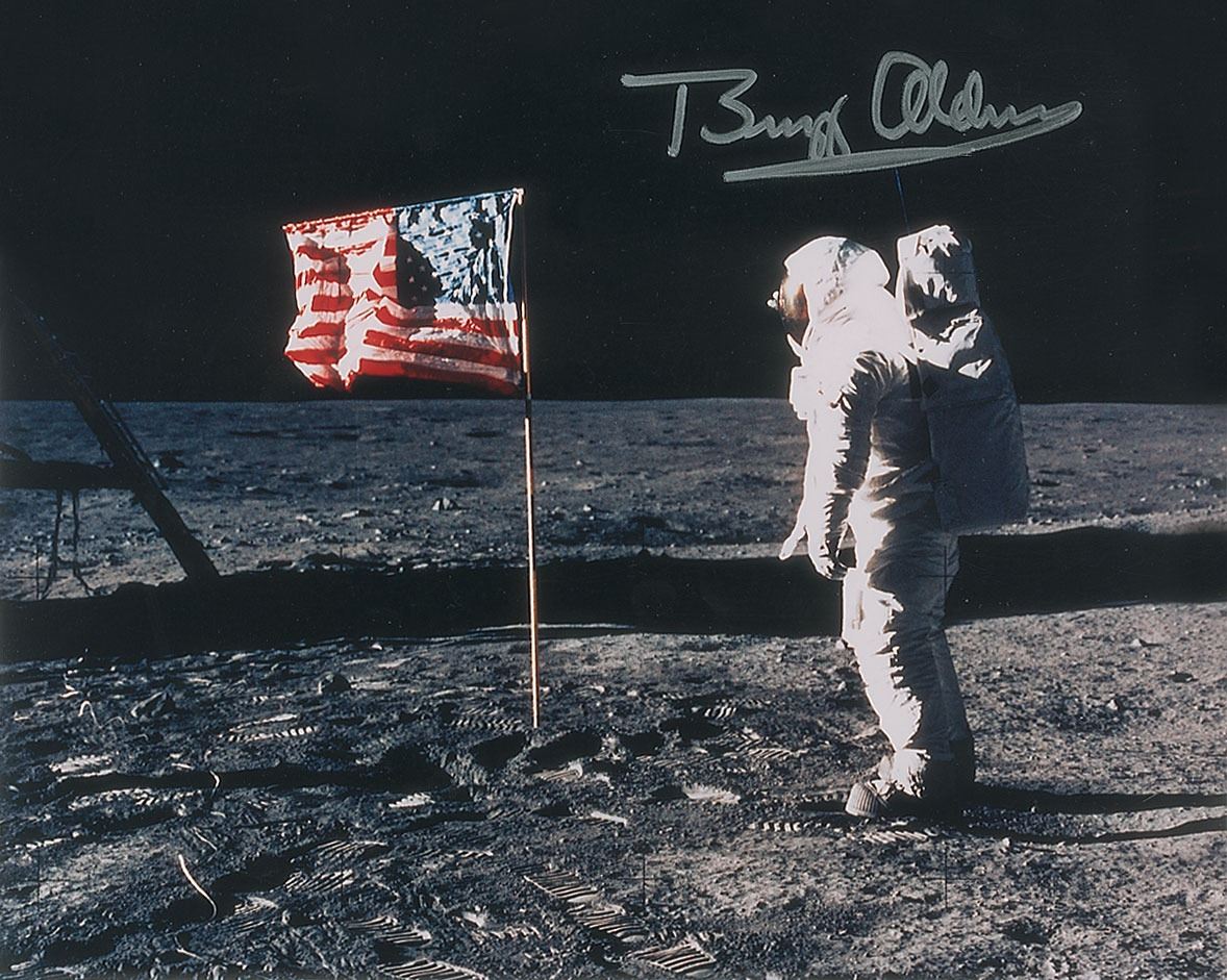 Color semi-glossy 10 x 8 full-length photo of LMP Buzz Aldrin standing next to the American flag during the Apollo 11 mission, signed in silver ink. In very fine condition. Accompanied by a certificate of authenticity from Novaspace.