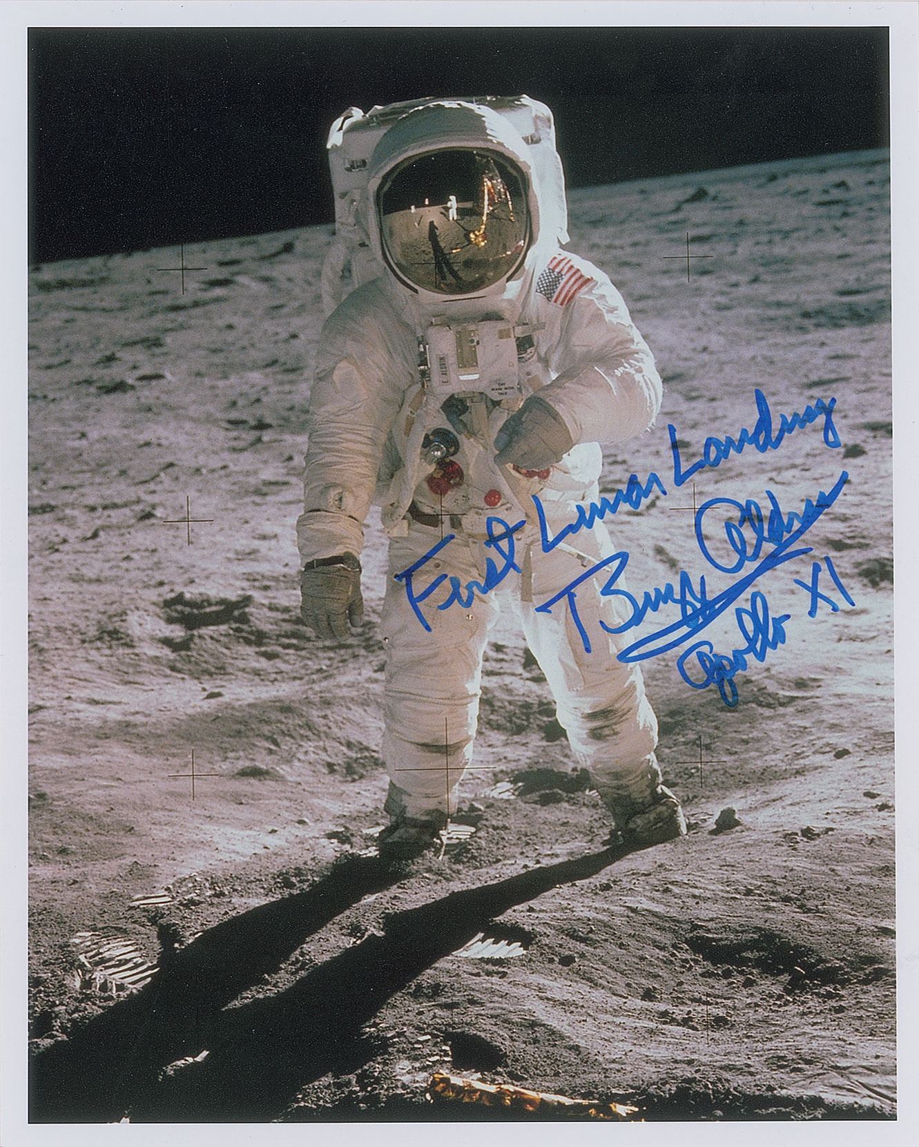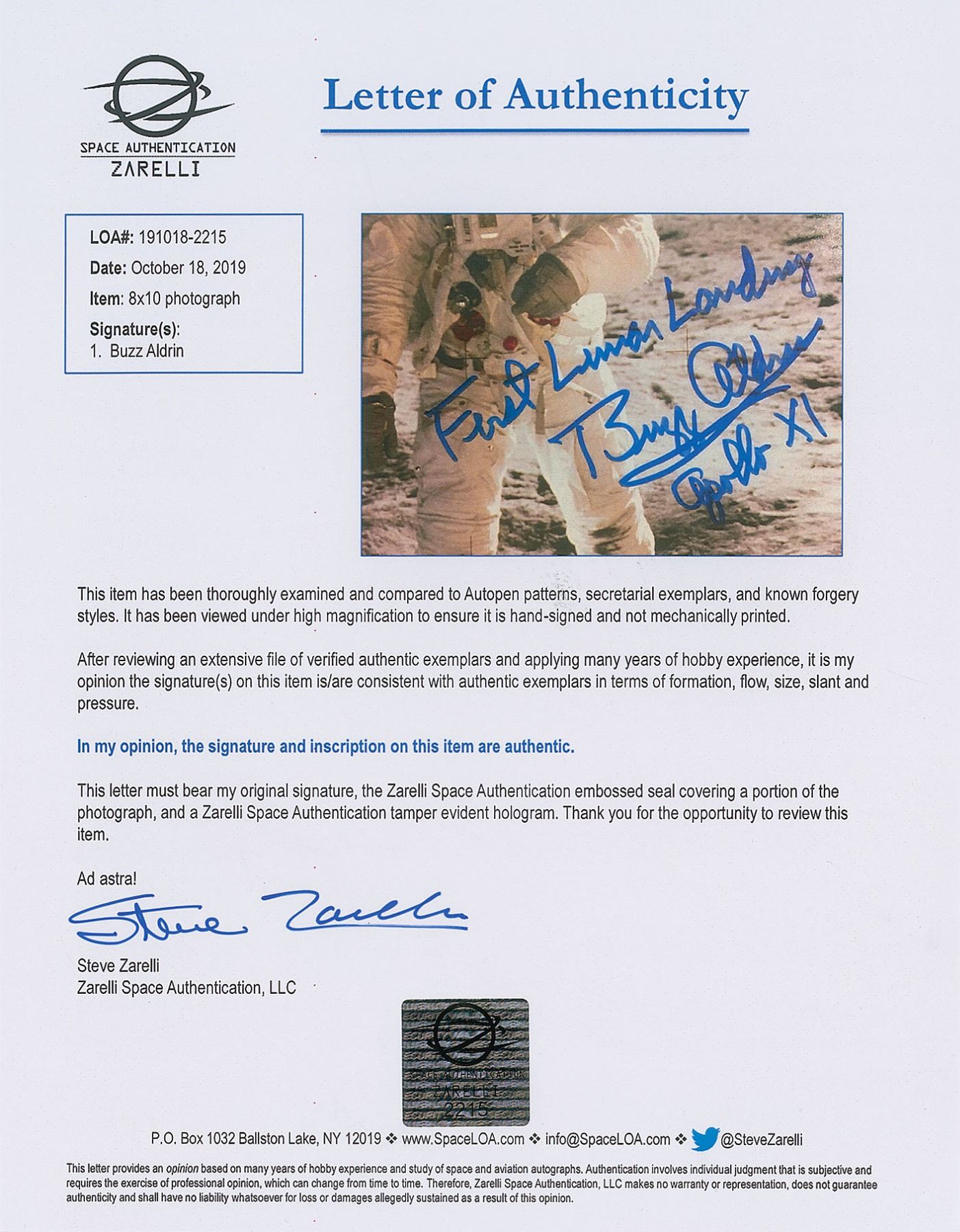 Color satin-finish 8 x 10 full-length photo of Aldrin standing on the lunar surface, his visor showing a small reflection of the photographer, Neil Armstrong, signed in blue felt tip, "First Lunar Landing, Buzz Aldrin, Apollo XI." In very fine condition. Accompanied by a full letter of authenticity from Zarelli Space Authentication.