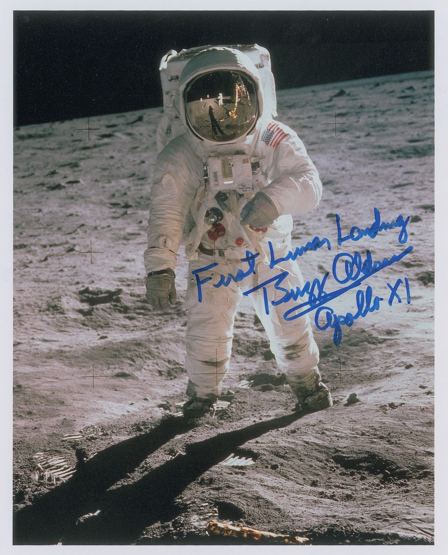 Color satin-finish 8 x 10 photo of Aldrin on the lunar surface, signed in blue felt tip, "First lunar landing, Buzz Aldrin Apollo XI." In very fine condition.