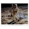 Color satin-finish 10 x 8 photo of Aldrin standing on the lunar surface, his visor showing a small reflection of the photographer, Neil Armstrong, signed and inscribed in blue felt tip, "To Peter, Lisa + Family, Best Wishes, Buzz Aldrin." In fine condition.