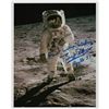 Color satin-finish 8 x 10 full-length photo of Aldrin standing on the lunar surface, his visor showing a small reflection of the photographer, Neil Armstrong, signed in blue felt tip, "First Lunar Landing, Buzz Aldrin, Apollo XI." In very fine condition.