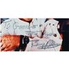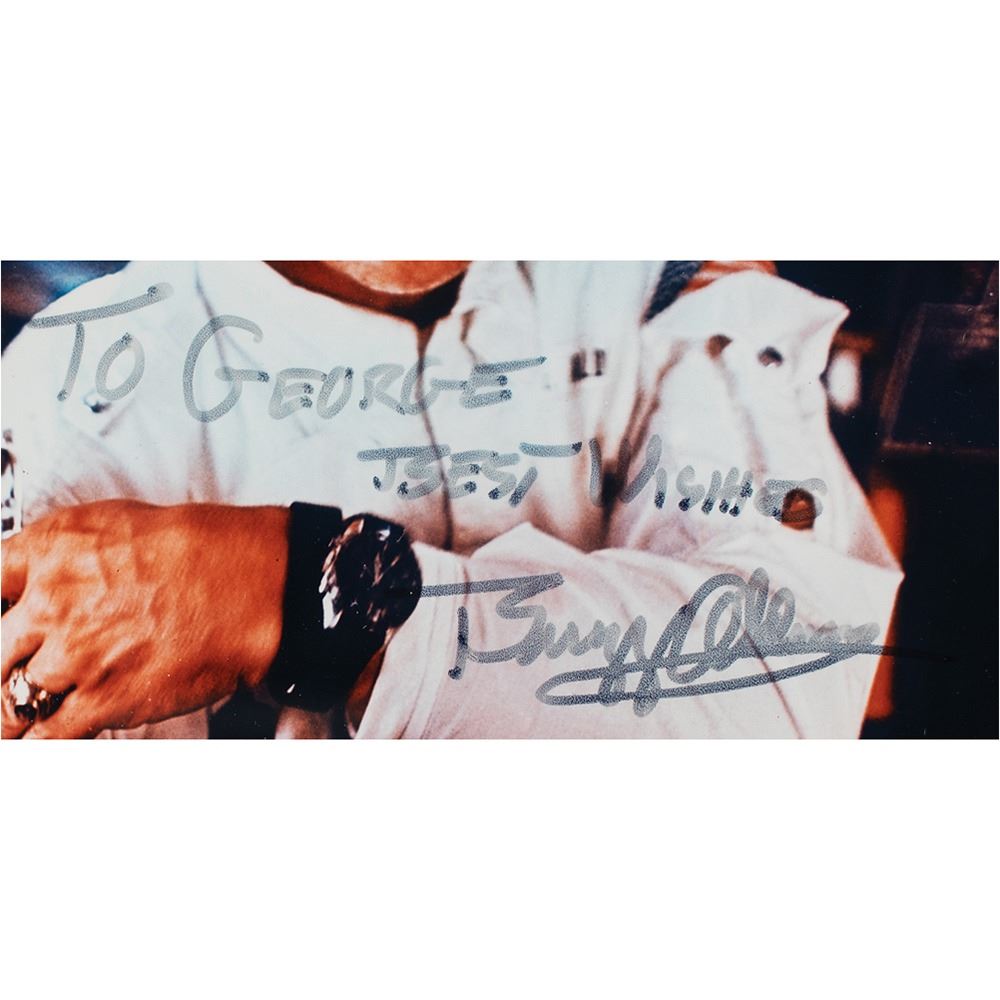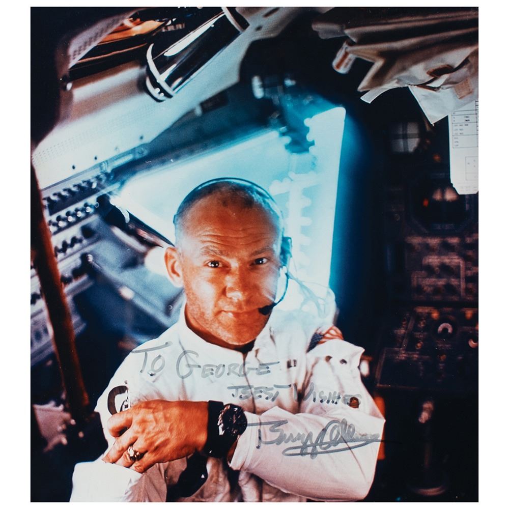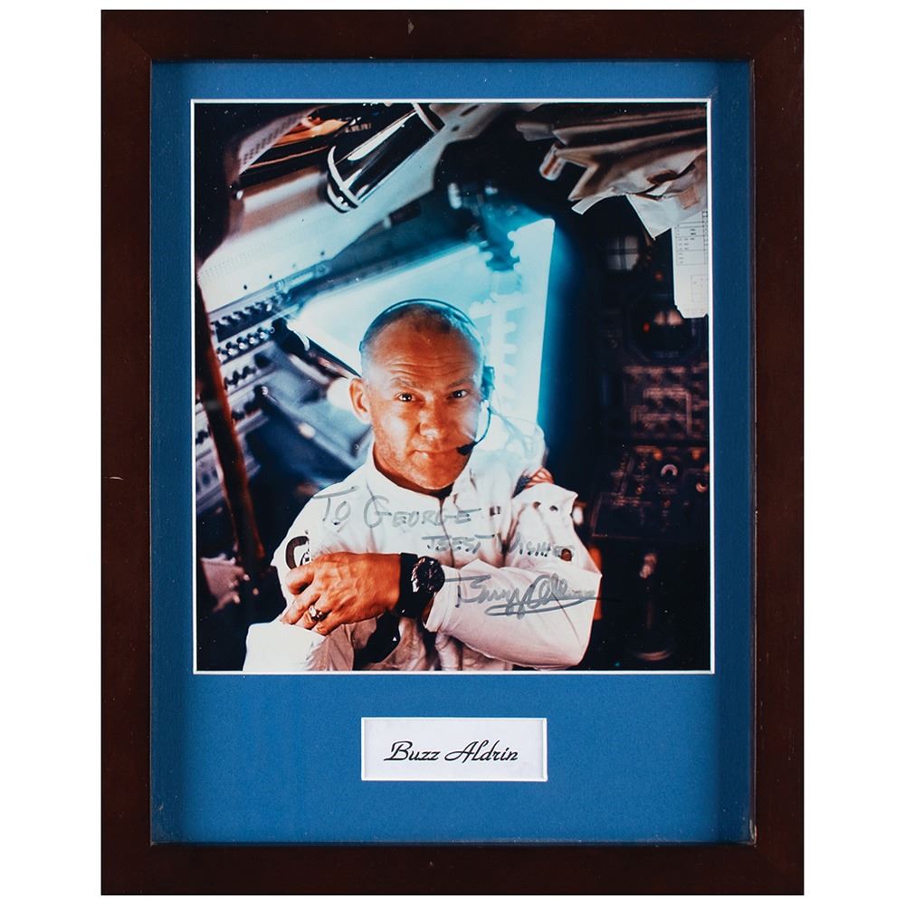 Color satin-finish 7 x 8 photo of Aldrin inside the Apollo 11 Lunar Module 'Eagle,' signed and inscribed in black felt tip, "To George, Best Wishes, Buzz Aldrin." Matted and framed with a nameplate to an overall size of 9.5 x 12. In fine condition, with the signature and inscription a few shades light.