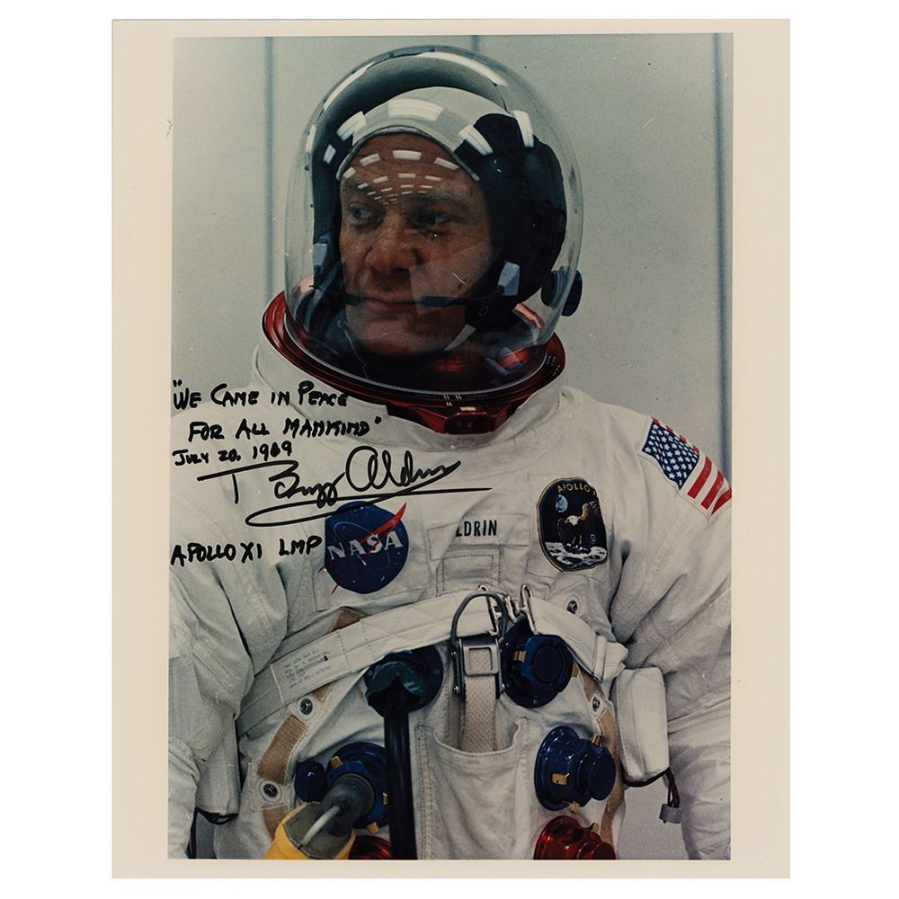 Color satin-finish 8 x 10 photo of Aldrin preparing for the Apollo 11 mission, signed in black felt tip, "'We came in peace for all mankind.' July 20, 1969, Buzz Aldrin, Apollo XI LMP." In fine condition, with a few small surface creases.