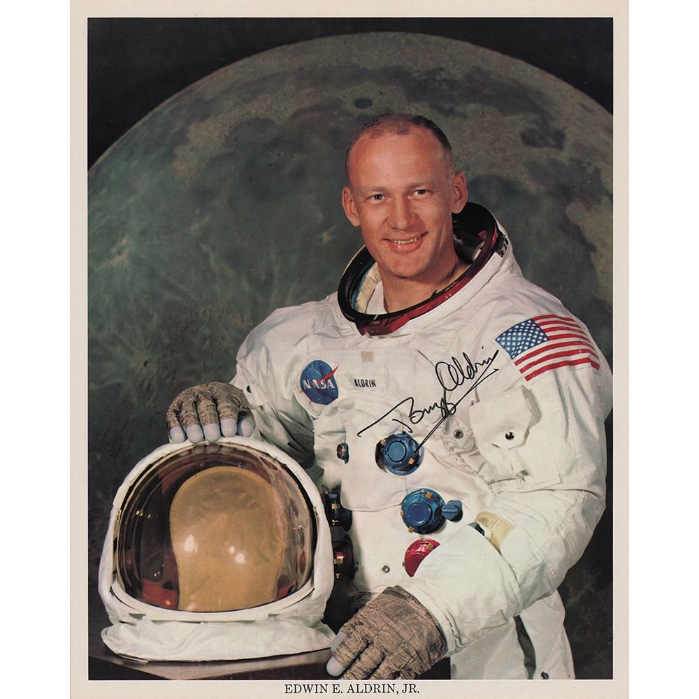 Official color 8 x 10 NASA lithograph of Buzz Aldrin wearing his white Apollo 11 space suit in front of a lunar backdrop, signed in black felt tip. In fine condition, with two small surface creases to the top.