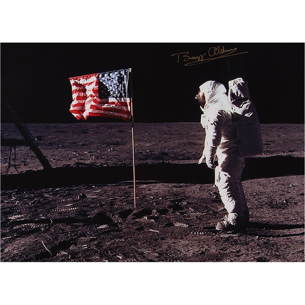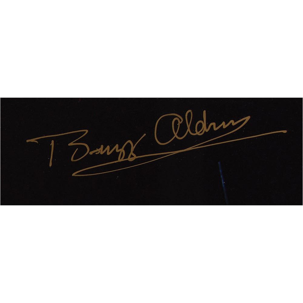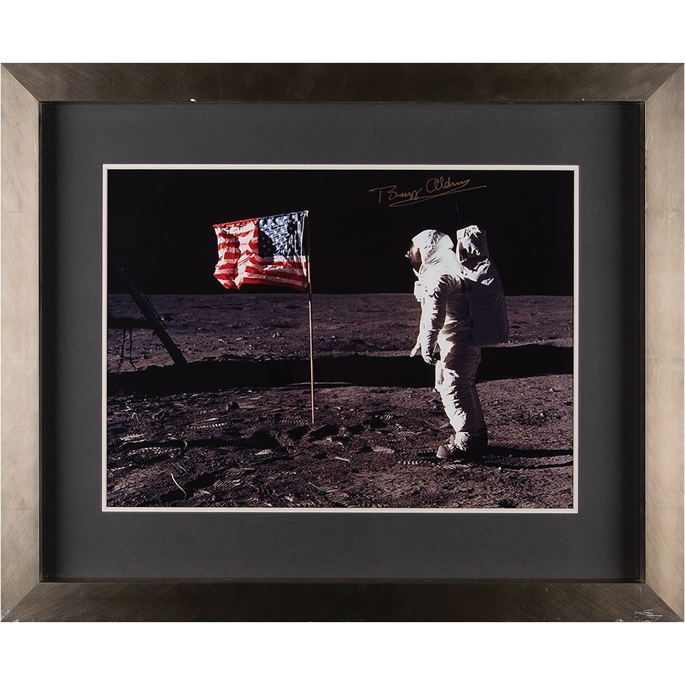 Stunning color satin-finish 19.25 x 14 photo of LMP Aldrin saluting the American flag on the lunar surface during his Apollo 11 EVA, nicely signed in gold ink, "Buzz Aldrin." Double-matted and framed to an overall size of 28 x 23. In fine condition, with several scratches to the frame.