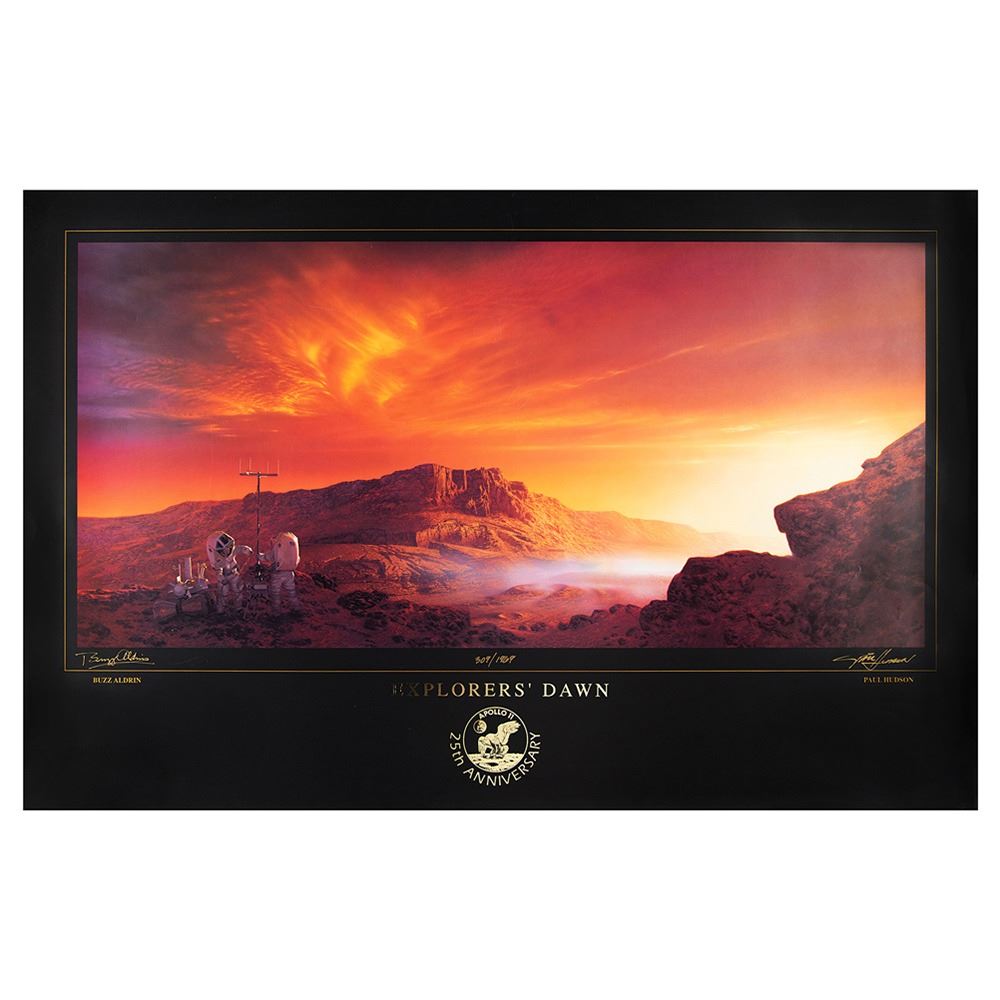 Limited edition color 34 x 22 print entitled 'Explorer's Dawn,' honoring the 25th anniversary of the Apollo 11 lunar landing, numbered 309/1969, signed in gold ink by Buzz Aldrin and artist Paul Hudson. In fine condition, with some small creases, light edgewear, and a tiny fleck of surface loss to the bottom edge.