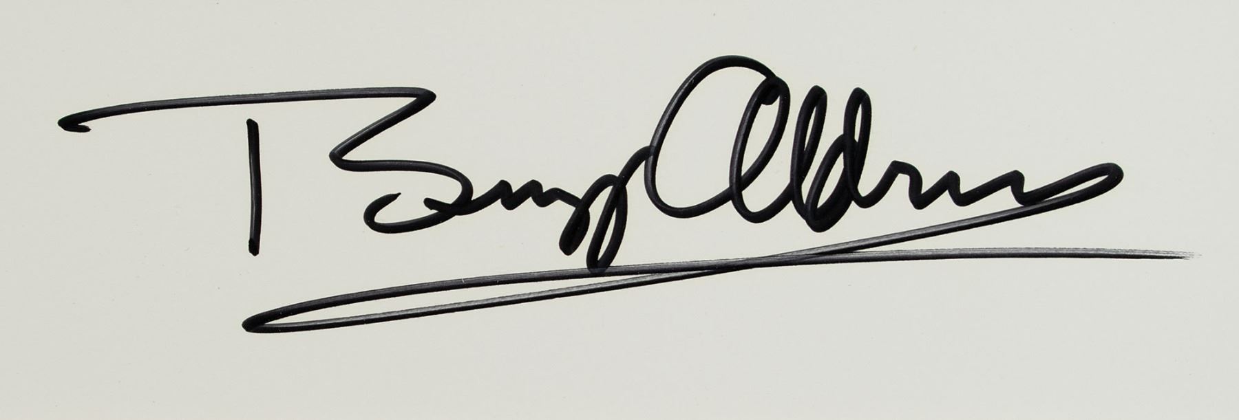 Limited edition color 25 x 20 print of LMP Buzz Aldrin standing on the lunar surface next to the American flag during the Apollo 11 mission, numbered 310/350, signed in the lower border in black felt tip. Matted to an overall size of 32 x 27.25. In fine condition.