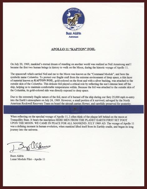 Buzz Aldrin typed letter signed on attractive embossed personal letterhead with an original piece of the ''Kapton'' foil from the command module that was flown to the moon. Reads in part, ''On July 20, 1969, mankind's eternal dream of standing on another world was realized as Neil Armstrong and I became the first two human beings in history to walk on the Moon.'' Letter, measuring 8.5'' x 11'', is in fine condition.