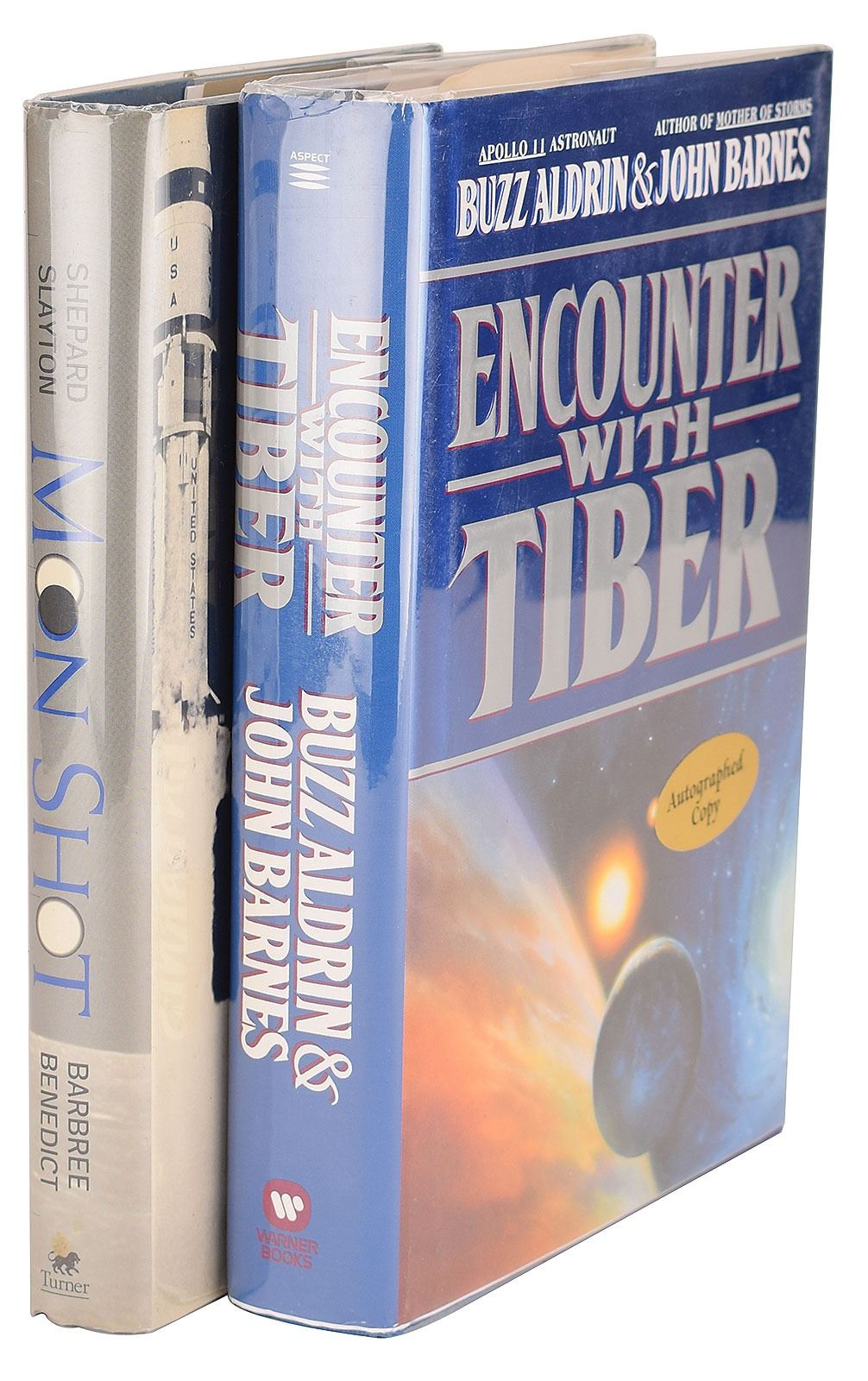 Two books, both hardcover with dust jacket: Encounter with Tiber, signed and inscribed on the first free end page in blue ink, "To my friend, Buzz Aldrin, 1996"; and Moon Shot, signed and inscribed on the title page in blue felt tip, "To Kay—Alan Shepard." In fine condition.