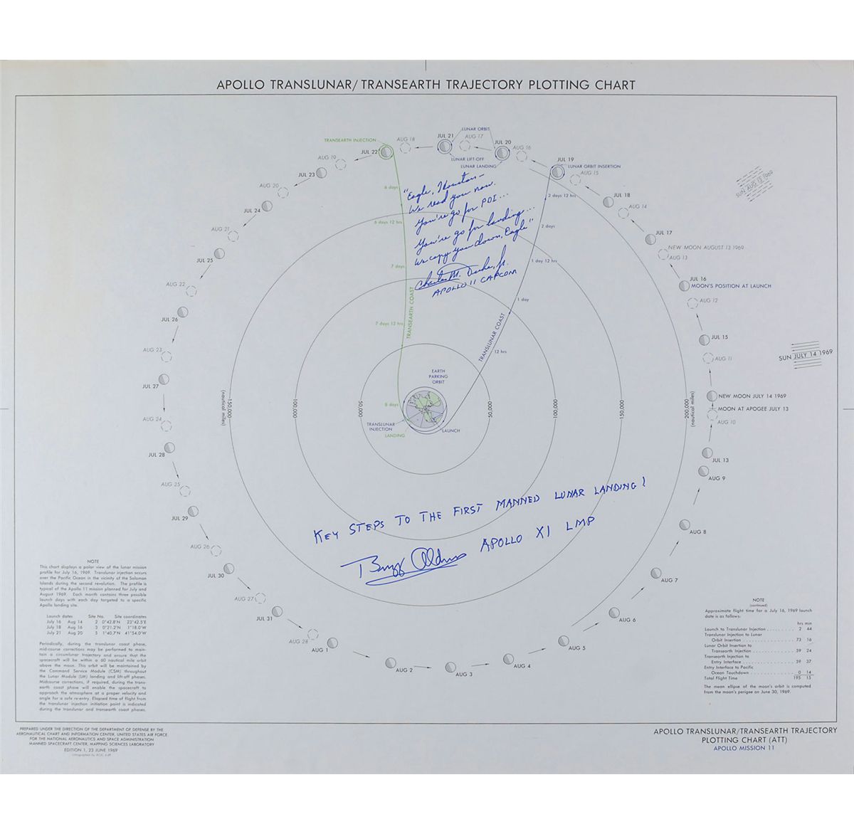 Color Apollo 11 Translunar/Transearth Trajectory Plotting Chart, 24 x 20, labeled in the lower border, “Edition 1, 23 June 1969,” prepared for NASA by the Department of Defense, and showing the trajectories for the mission’s translunar and transearth coast. Signed in blue felt tip, “‘Eagle, Houston—We read you now. You're go for PDI… You’re go for landing… We copy you down Eagle.’ Charles M. Duke, Jr. Apollo 11 CAPCOM,” and “Key steps to the first manned lunar landing! Buzz Aldrin, Apollo XI LMP.” In fine condition. This map plots the location of all major flight events for the first lunar landing including launch, translunar injection, lunar and earth coast phases, lunar orbit insertion, lunar landing and liftoff, and transearth injection. An important piece for the mission which highlights each critical phase from start to finish, signed by the first two astronauts to communicate from the moon to the earth.