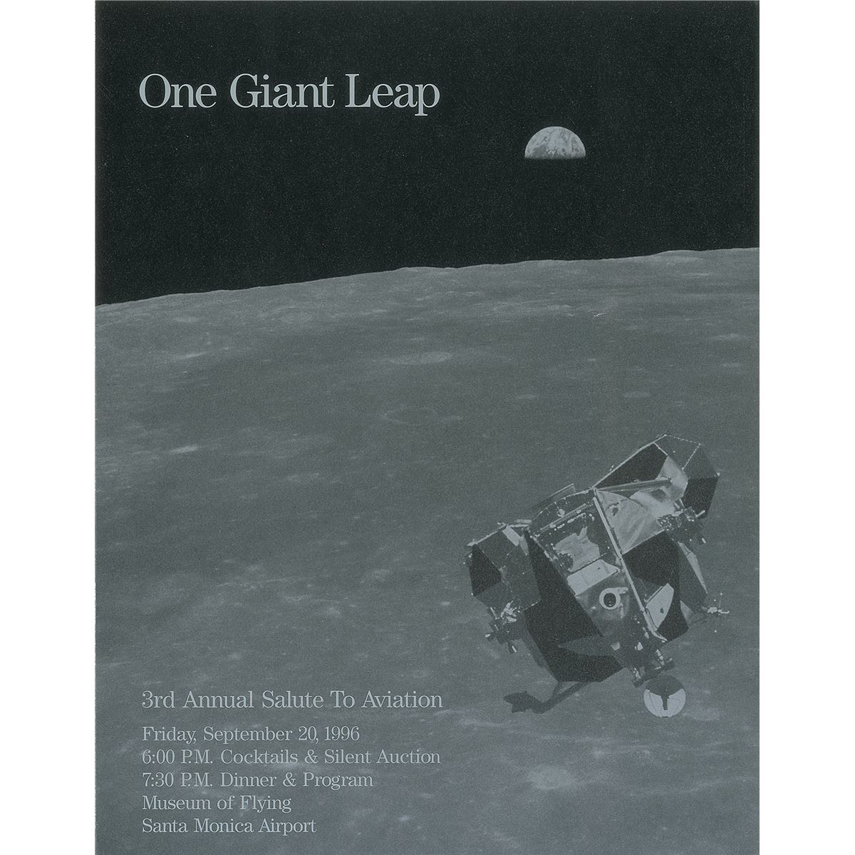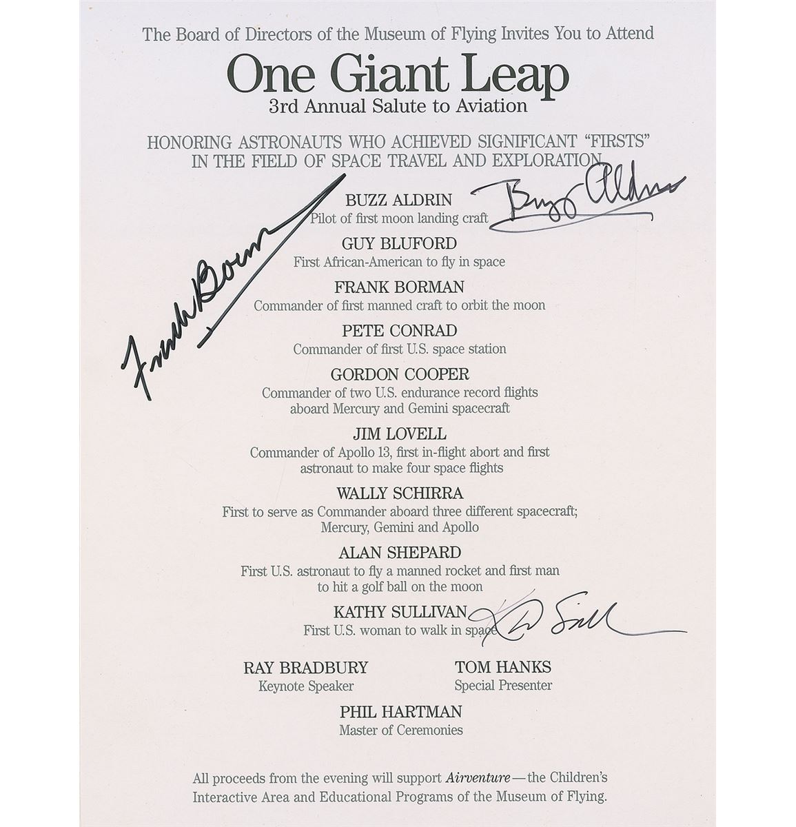 Program for the Museum of Flying’s third annual salute to aviation, 8.5 x 11, two pages, held on September 20, 1996, at the Museum of Flying at the Santa Monica Airport, signed inside in black felt tip by Buzz Aldrin, Frank Borman, and Kathy Sullivan. In fine condition.