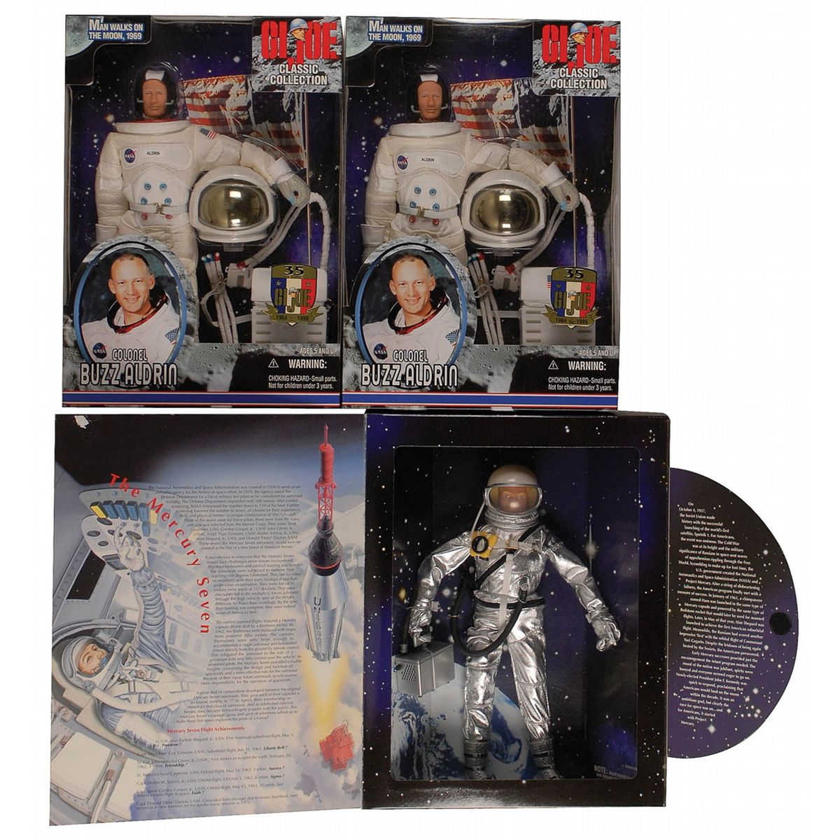 Three GI Joe action figures: two ‘Classic Edition ‘ Buzz Aldrin figures, featuring Aldrin dressed in his white spacesuit, and one ‘Classic Edition’ Mercury astronaut figure, featuring an astronaut in the classic silver Mercury spacesuit. In fine condition, with all unopened and in their original packaging.
