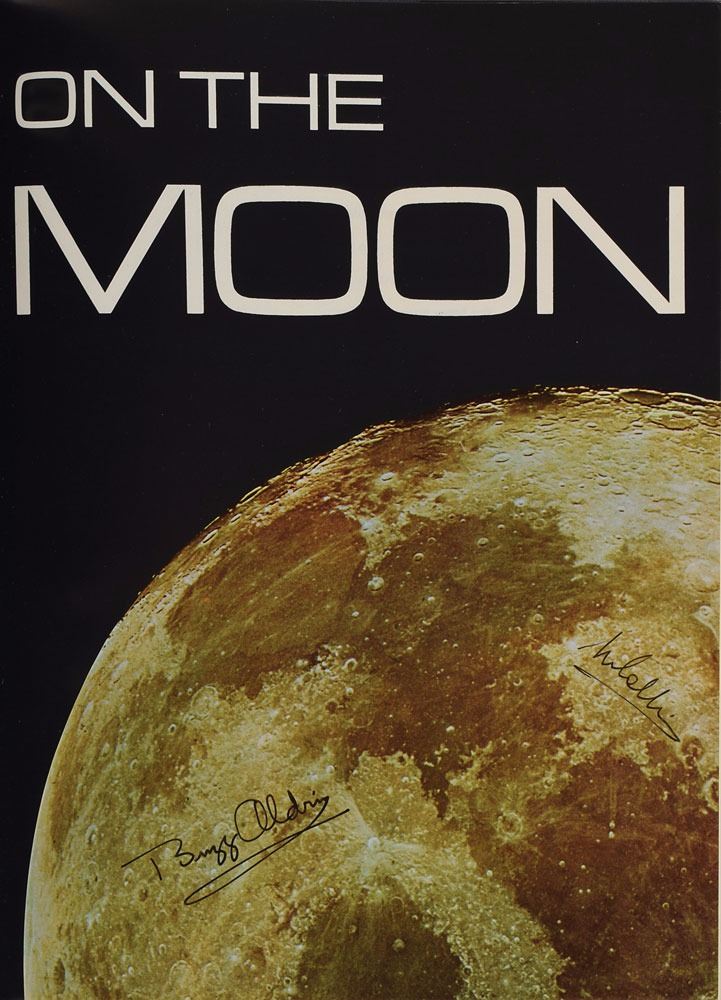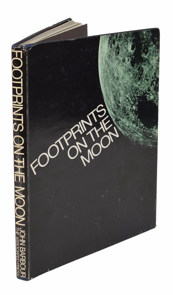 Signed book: Footprints on the Moon. NY: American Book–Stratford Press, 1969. Hardcover with dust jacket, 9.5 x 12.25, 214 pages. Signed on the title page in black felt tip, "Buzz Aldrin" and "M. Collins." In very good to fine condition, with scattered wear, rubbing, and chipped edges to dust jacket, with inner flaps affixed to front and back pastedowns.
